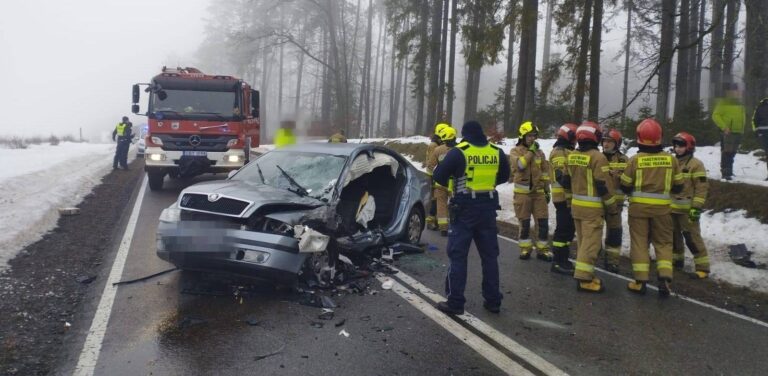 63-letnia kobieta kierująca skodą zjechała na przeciwległy pas ruchu i czołowo zderzyła się z dostawczym mercedesem. Ranna kobieta została przewieziona do szpitala.
