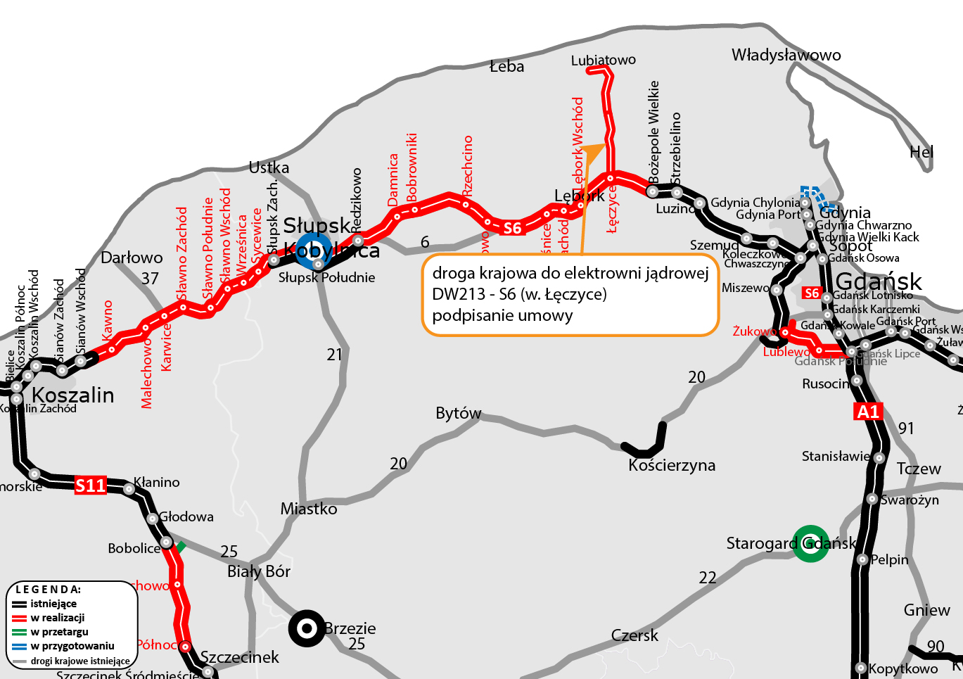 Generalna Dyrekcja Dróg Krajowych i Autostrad poinformowała o podpisaniu umowy na zaprojektowanie i budowę drogi krajowej do elektrowni jądrowej na odcinku od drogi wojewódzkiej nr 213 do węzła Łęczyce na S6. To jeden z dwóch fragmentów trasy do przyszłej elektrowni „Lubiatowo-Kopalino” w gminie Choczewo.