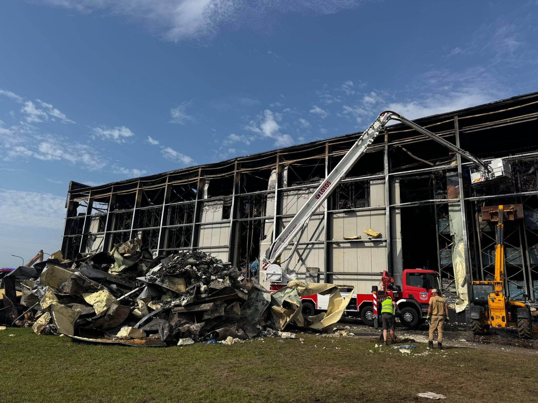 Ciężki sprzęt służący do rozbierania konstrukcji spalonej hali. Kawle, 18.08.2025 r. (fot. PSP)
