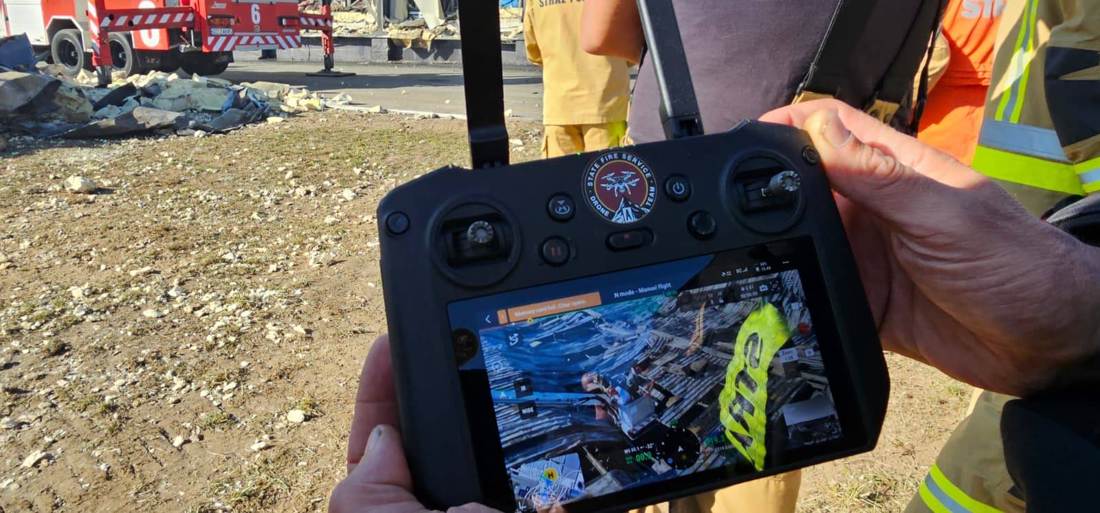 Sterownik drona strażackiego. Akcja ratunkowa po pożarze w Kawlach, 17.08.2025 r. (fot. PSP)