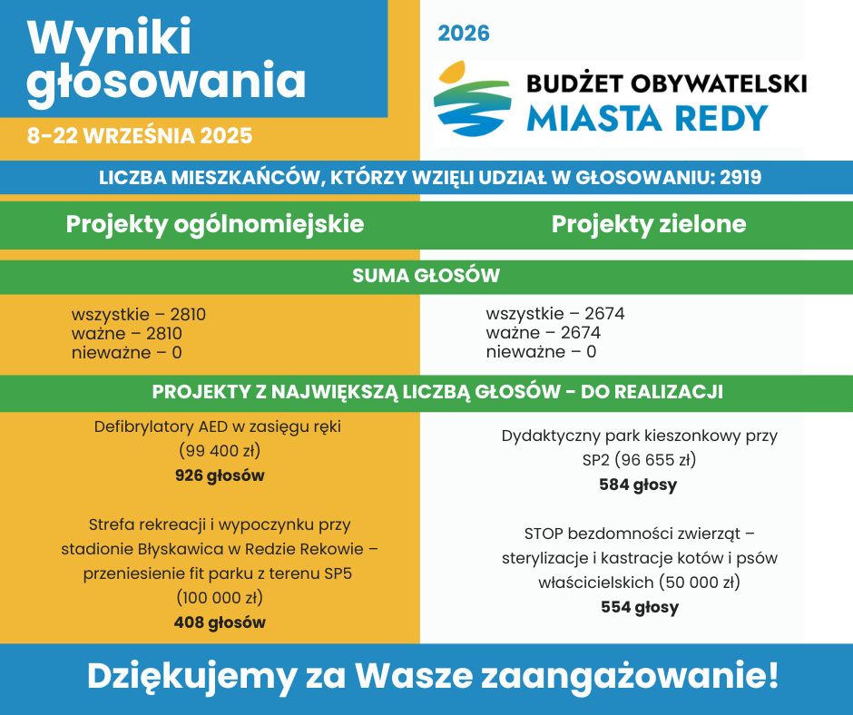 Tegoroczna edycja budżetu obywatelskiego w Redzie cieszyła się zainteresowaniem mieszkańców. W głosowaniu udział wzięło 2919 osób, które wspólnie zdecydowały, jakie projekty zostaną zrealizowane w mieście. Jedna trzecia z nich zagłosowała na defibrylatory w przestrzeni miejskiej. W tym roku do wyboru były zadania w dwóch kategoriach: ogólnomiejskiej oraz zielonej.