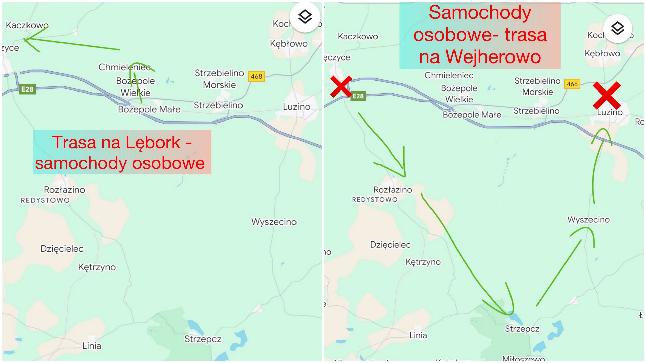 Objazd wyłącznie dla samochodów osobowych. Kierowcy jadący z Lęborka w stronę Wejherowa powinni zjechać w Godetowie na miejscowość Rozłazino a następnie kierować się przez Strzepcz – Wyszecino, skąd można wyjechać w Luzinie i kontynuować jazdę do Wejherowa.