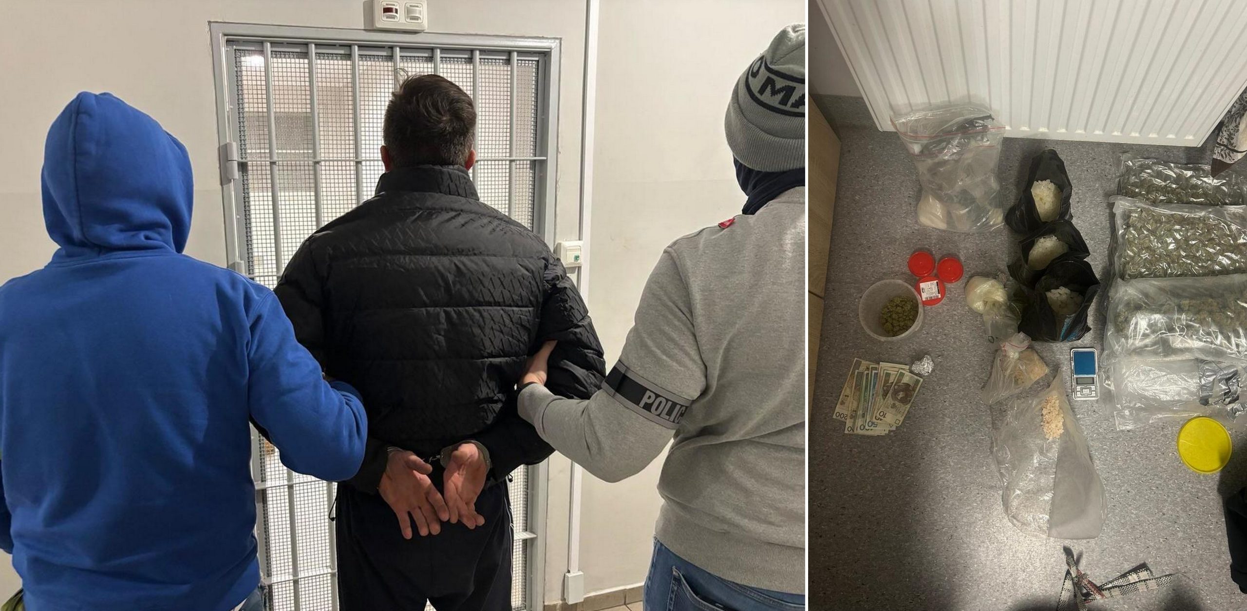 Policjanci przeszukali pojazd, miejsce zamieszkania oraz garaż. W trakcie przeprowadzonych czynności funkcjonariusze ujawnili łącznie około sześciu kilogramów substancji zabronionych w postaci suszu roślinnego oraz tzw. kryształu. Zabezpieczono również gotówkę w kwocie ponad 1,5 tys. zł. Wszystkie ujawnione środki zostały zabezpieczone do dalszych badań laboratoryjnych.