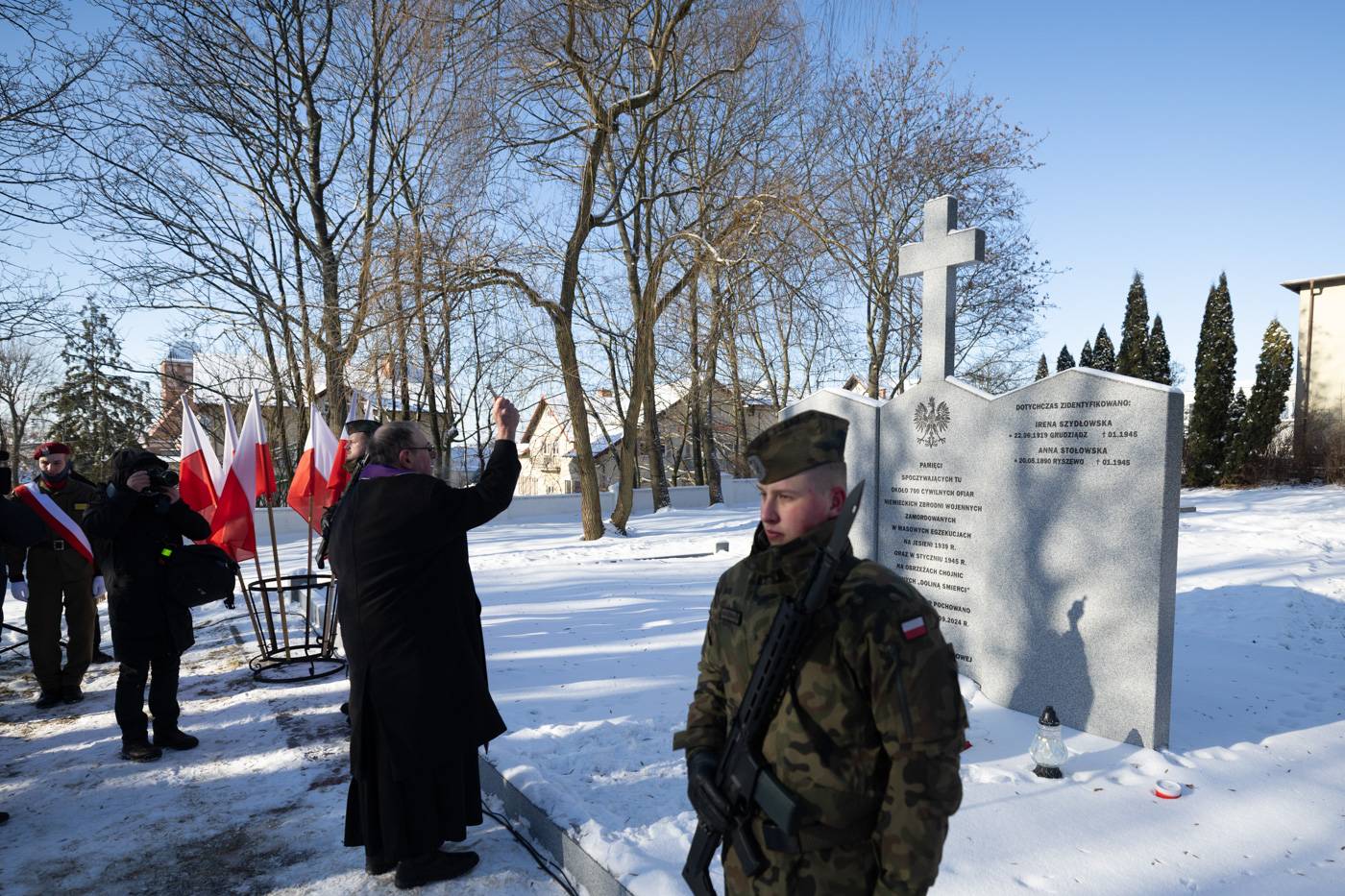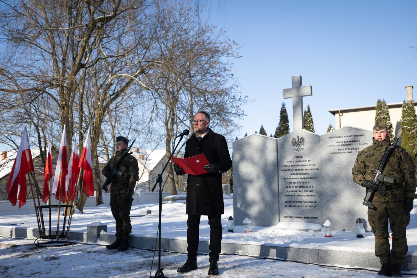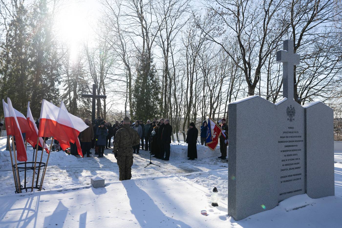 Uroczystość poświęcenia pomnika na mogile ok. 700 ofiar niemieckich zbrodni wojennych. Chojnice, 31.01.2026 r. (IPN/Roman Jocher)