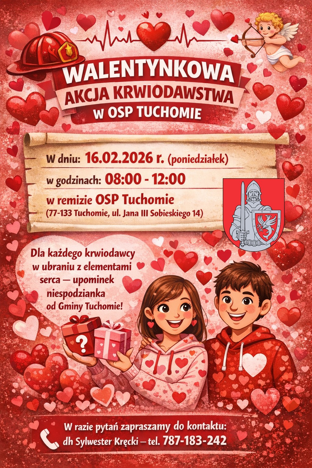 Gmina Tuchomie i powiat  bytowski organizują w poniedziałek, 16 lutego, Walentynkową Akcję Krwiodawstwa w OSP Tuchomie. Krew można oddać w godzinach 8:00-12:00 w remizie przy ul. Jana III Sobieskiego.