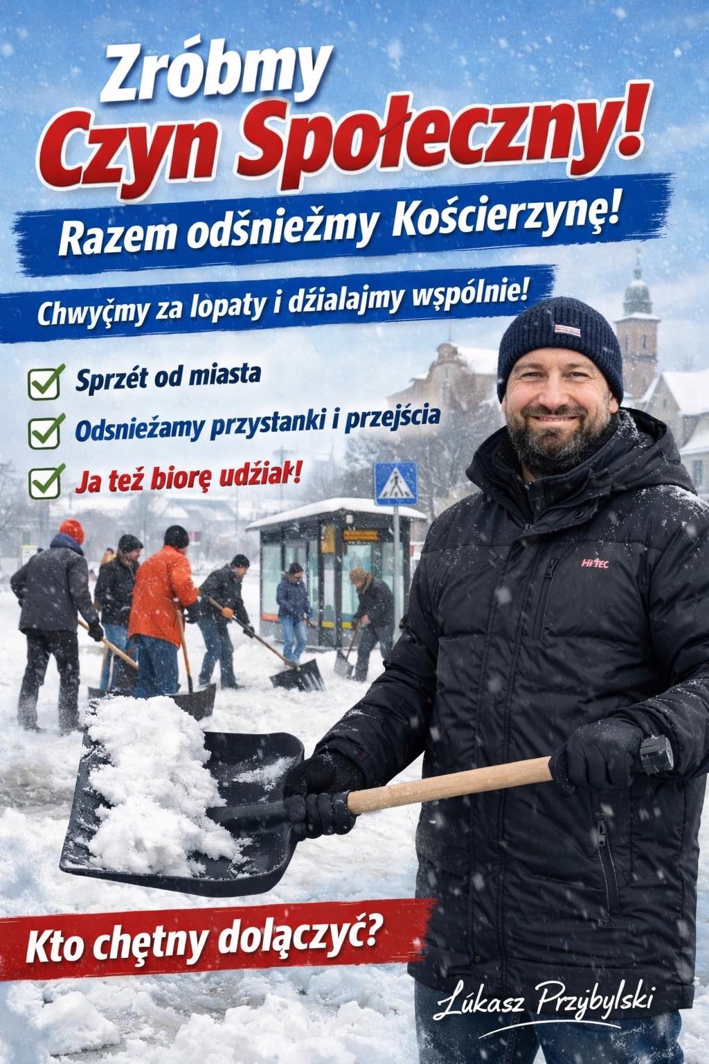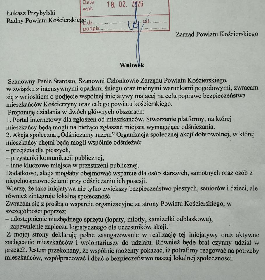 Radny powiatu kościerskiego Łukasz Przybylski proponuje, aby w ramach czynu społecznego wziąć się za odśnieżanie. Najpierw planował akcję wyłącznie w mieście, ale teraz chce rozszerzyć ją na cały powiat.