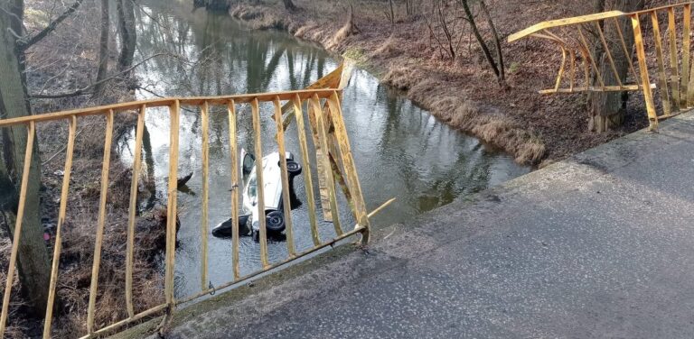 Poważny wypadek w centrum Pelplina. Przy ulicy Starogardzkiej, z wiaduktu do rzeki Wierzycy wpadł samochód osobowy.