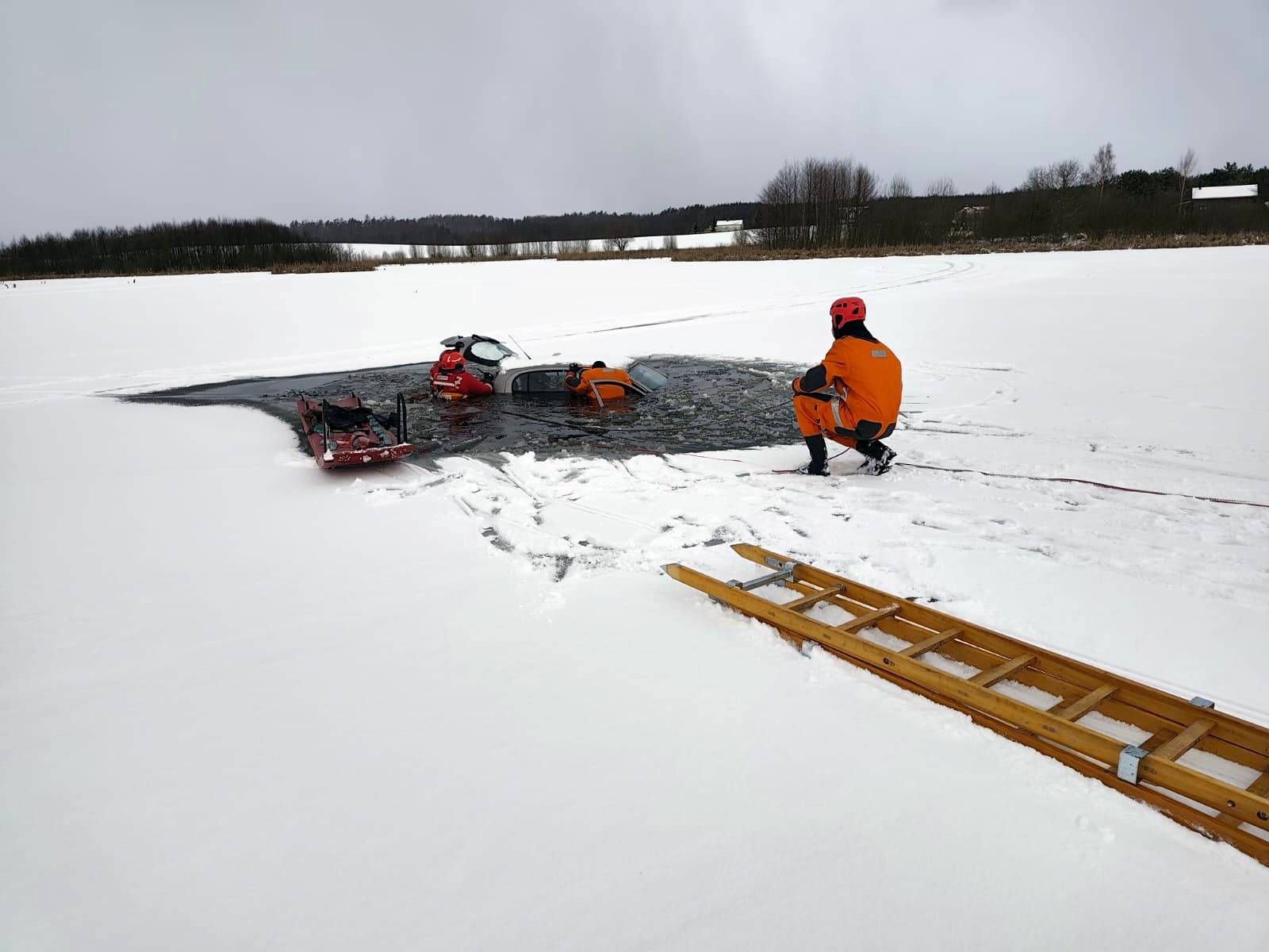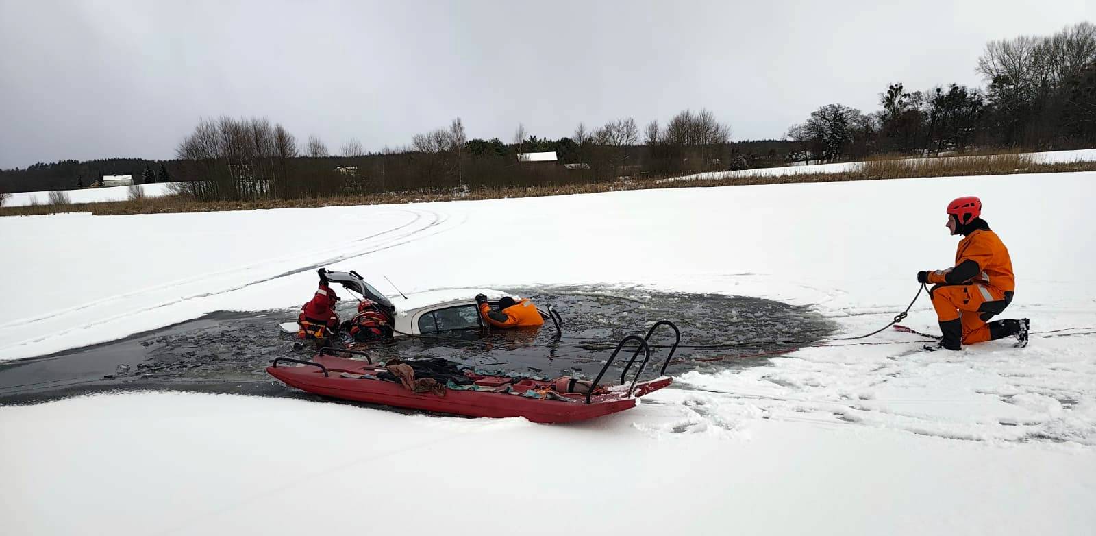 W miejscowości Szczerbięcin w gminie Tczew doszło do niebezpiecznego zdarzenia na zamarzniętym jeziorze. Dwóch mężczyzn wjechało samochodem osobowym na taflę lodu. W pewnym momencie lód załamał się pod pojazdem, który zapadł się na środku jeziora. Nad powierzchnią wody widoczny był jedynie dach auta.