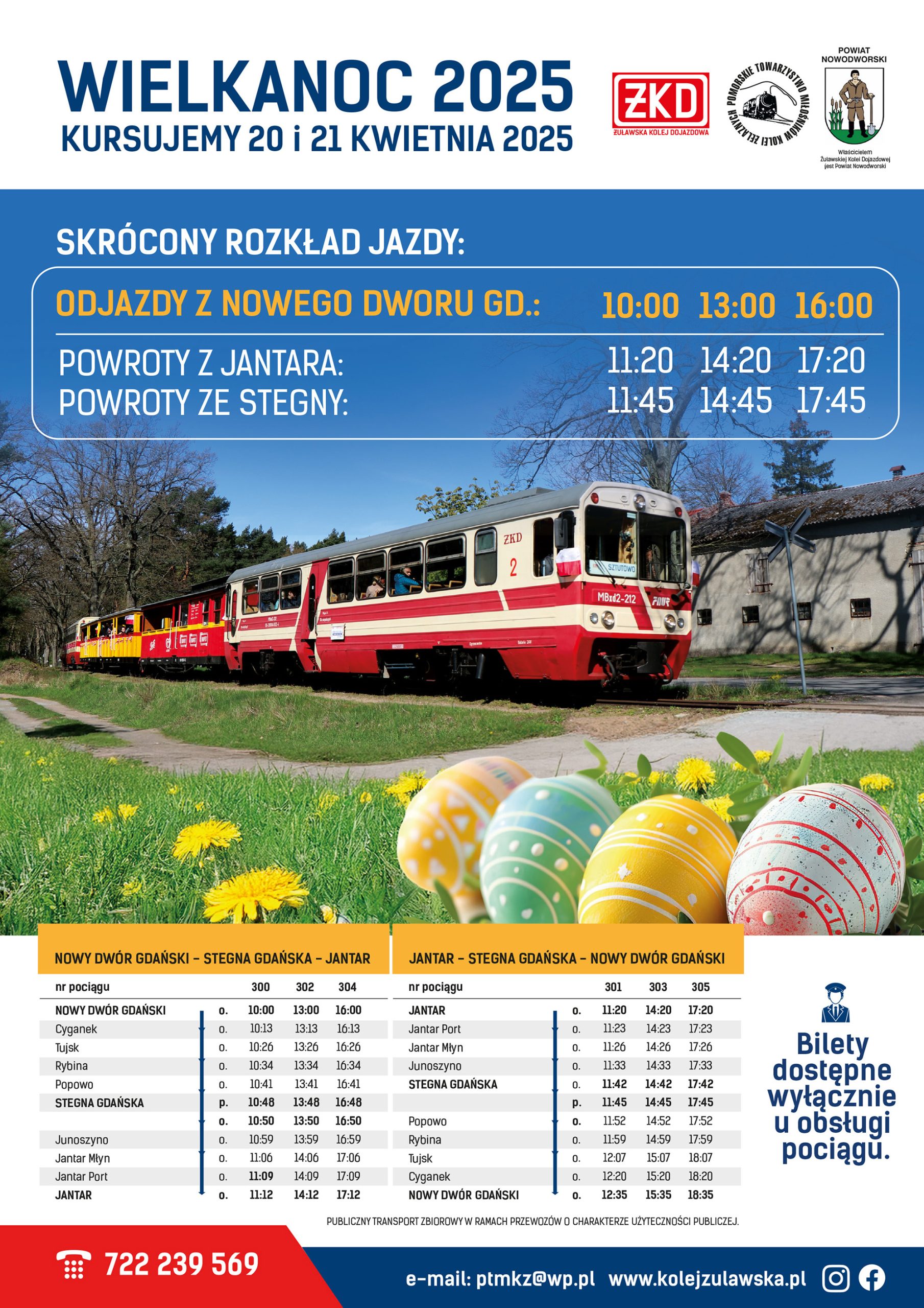 W związku ze zbliżającymi się Świętami Wielkanocnymi Żuławska Kolej Dojazdowa poinformowała, że Pomorskie Towarzystwo Miłośników Kolei Żelaznych uruchamia specjalne pociągi pasażerskie, kursujące w dniach 20 i 21 kwietnia 2025 roku na trasie Nowy Dwór Gdański – Stegna Gdańska – Jantar.