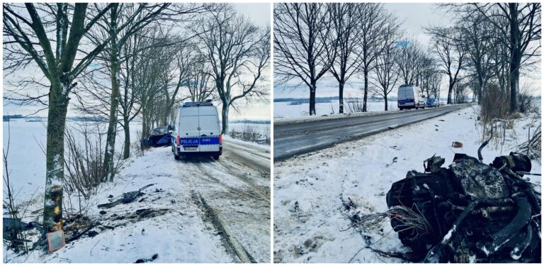 Jako pierwsza na śliskiej drodze panowanie straciła 39-latka – jej auto wypadło z jezdni i uderzyło w drzewo. Z samochodu na drogę wyleciał silnik, który uruchomił reakcję łańcuchową.
