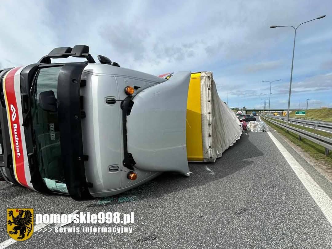 – Kierujący pojazdem ciężarowym 43-latek nie zapanował nad prowadzonym przez siebie zestawem z uwagi na nieprawidłowo zabezpieczony ładunek, w wyniku czego ciągnik siodłowy wraz z naczepą przewrócił się. Badanie alkomatem wykazało, że kierowca był trzeźwy, a zdarzenie zakwalifikowano jako kolizję. Droga w kierunku Gdańska jest całkowicie zablokowana. Policjanci kierują na objazdy przez centrum miasta. Utrudnienia mogą potrwać jeszcze kilka godzin – poinformował sierż. szt. Amadeusz Galus ze słupskiej policji.