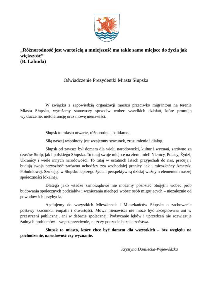 W odpowiedzi na zapowiedź marszu Krystyna Danilecka-Wojewódzka, prezydent Słupska, wydała oświadczenie, w którym wyraziła stanowczy sprzeciw wobec wszelkich działań promujących wykluczenie, nietolerancję oraz mowę nienawiści.