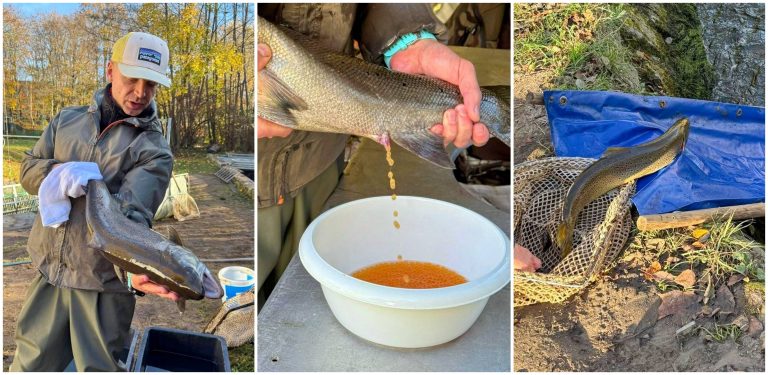 Sztuczne tarło troci i łososi przeprowadzane przez wędkarzy i naukowców przy rzece Słupi, 07.11.2025 r. (fot. Radio Gdańsk/Łukasz Kosik)