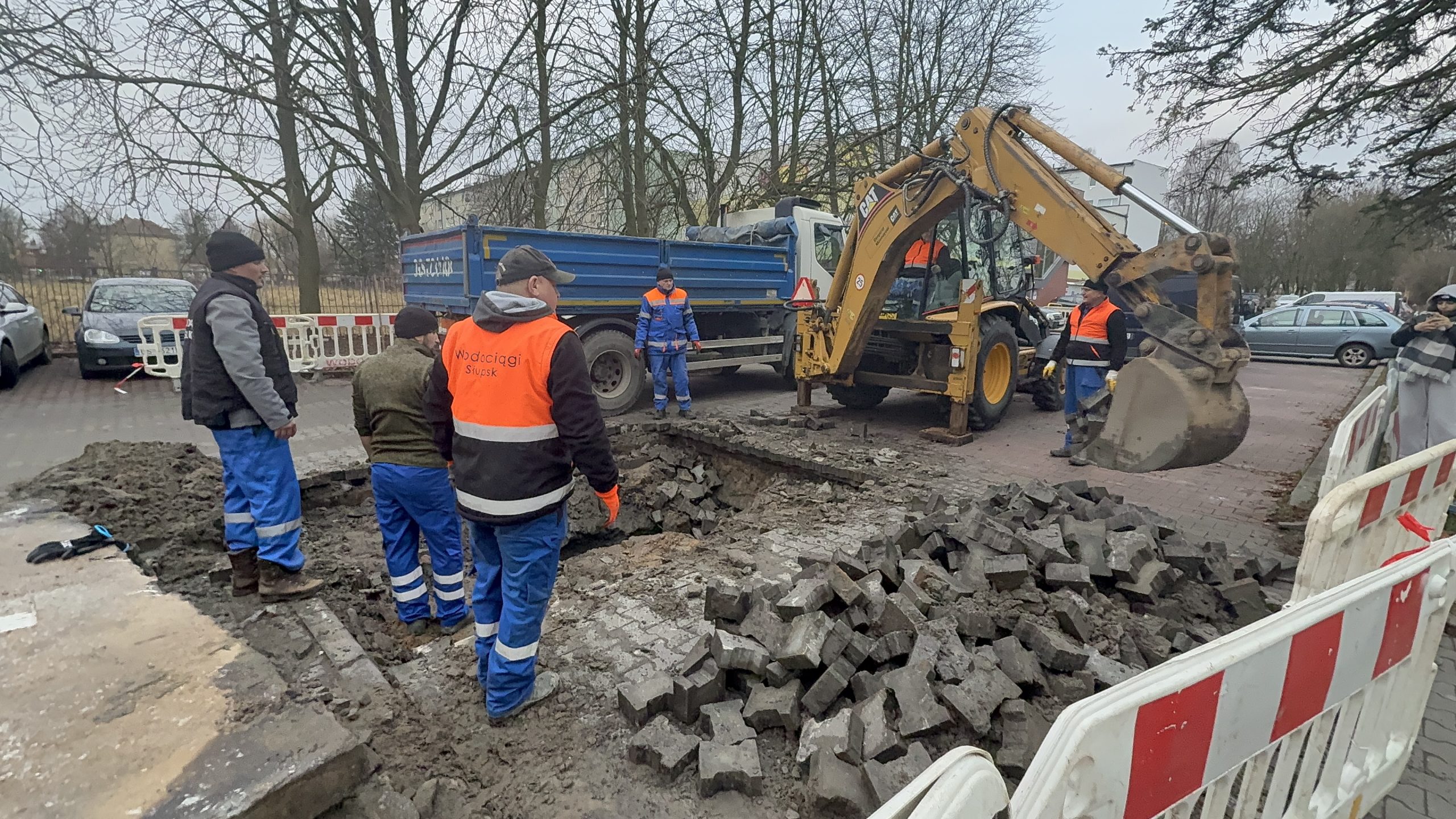 Służby wodociągowe, aby dotrzeć do pękniętej rury, przy użyciu koparki zerwały kostkę brukową oraz betonowe płyty, pod którymi ukazał się kilkumetrowy lej. Prezes słupskich wodociągów Andrzej Wójtowicz zapewnia, że na miejscu pracują najbardziej wykwalifikowani pracownicy.