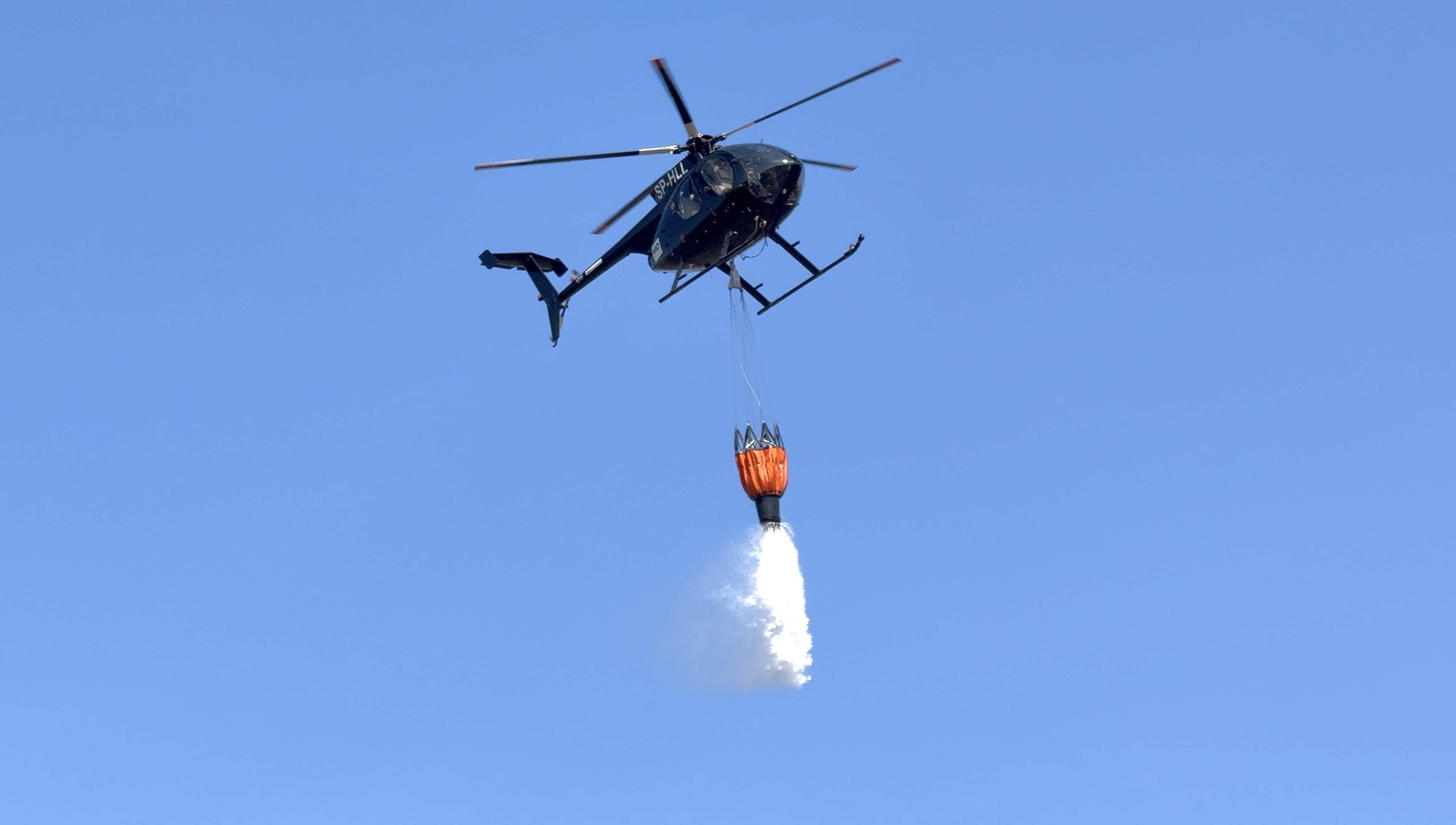 W manewrach uczestniczył również śmigłowiec Lasów Państwowych, który pobierał wodę z rzeki i transportował w rejon działań strażaków. Wszystko było koordynowane przez rozstawione nieopodal centrum dowodzenia.