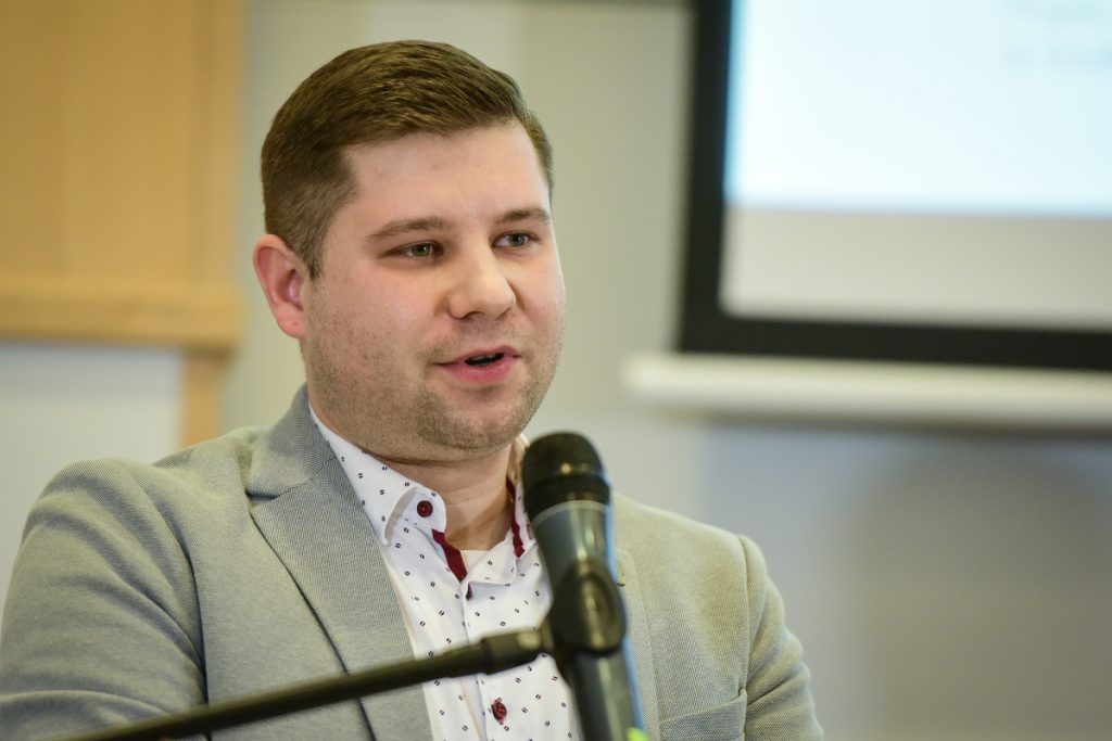 22.02.2022. Gdańsk. Konferencja prasowa z okazji zakończenia projektu „2 statki – wspólne morze. Sołdek i Vityaz: dziedzictwo morskie Polski i Rosji”. Nz. Jakub Adamczak (fot. Radio Gdańsk/Roman Jocher).