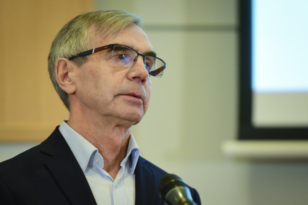 22.02.2022. Gdańsk. Konferencja prasowa z okazji zakończenia projektu „2 statki – wspólne morze. Sołdek i Vityaz: dziedzictwo morskie Polski i Rosji”. Nz dr Leszek Buller (fot. Radio Gdańsk/Roman Jocher).