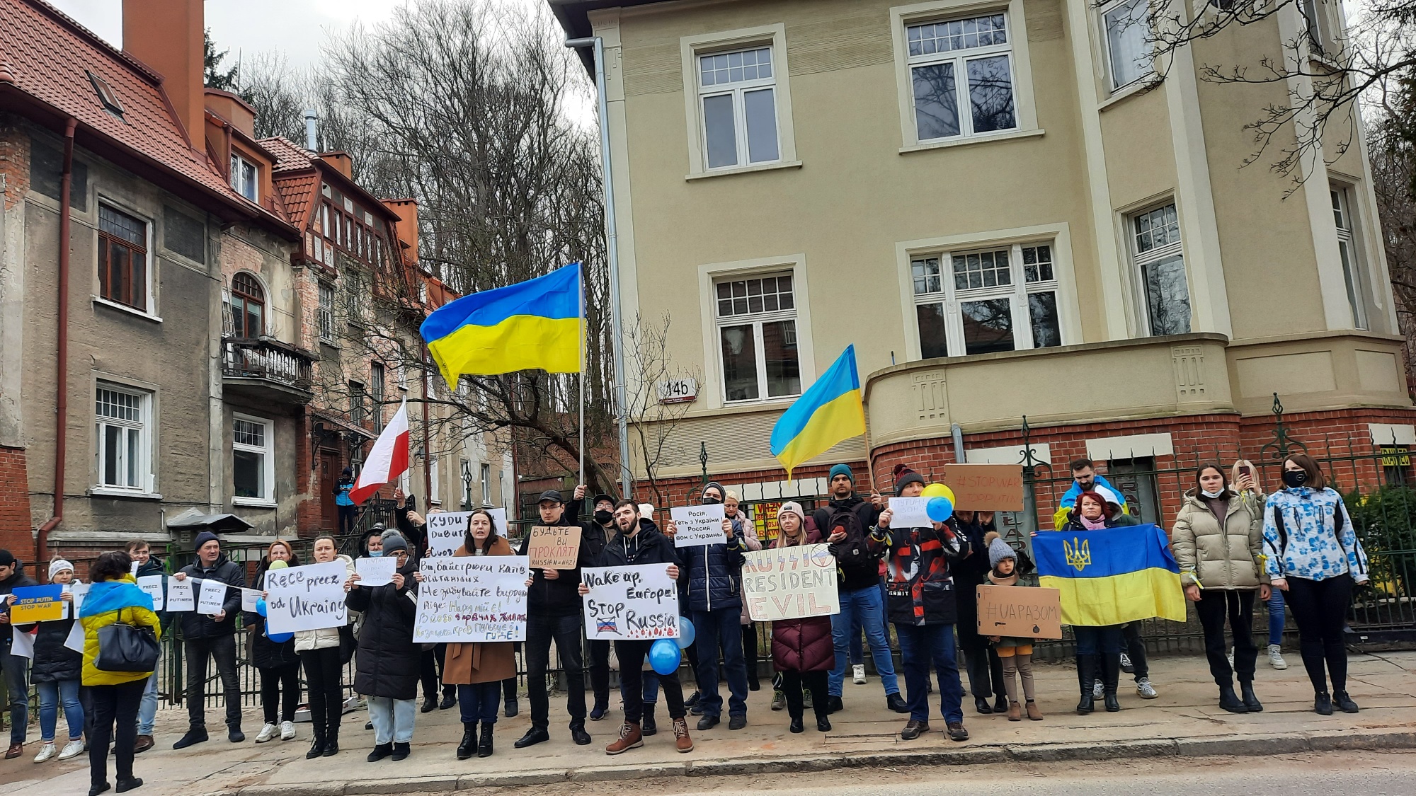 W Gdańsku, przed Konsulatem Generalnym Ukrainy, od rana gromadzą się ludzie z flagami i transparentami, chcąc okazać swoją solidarność z Ukrainą.