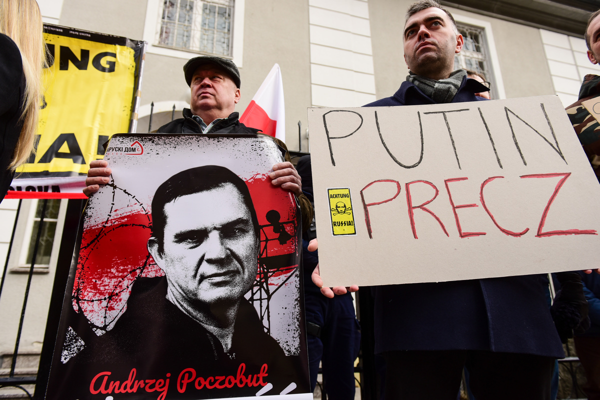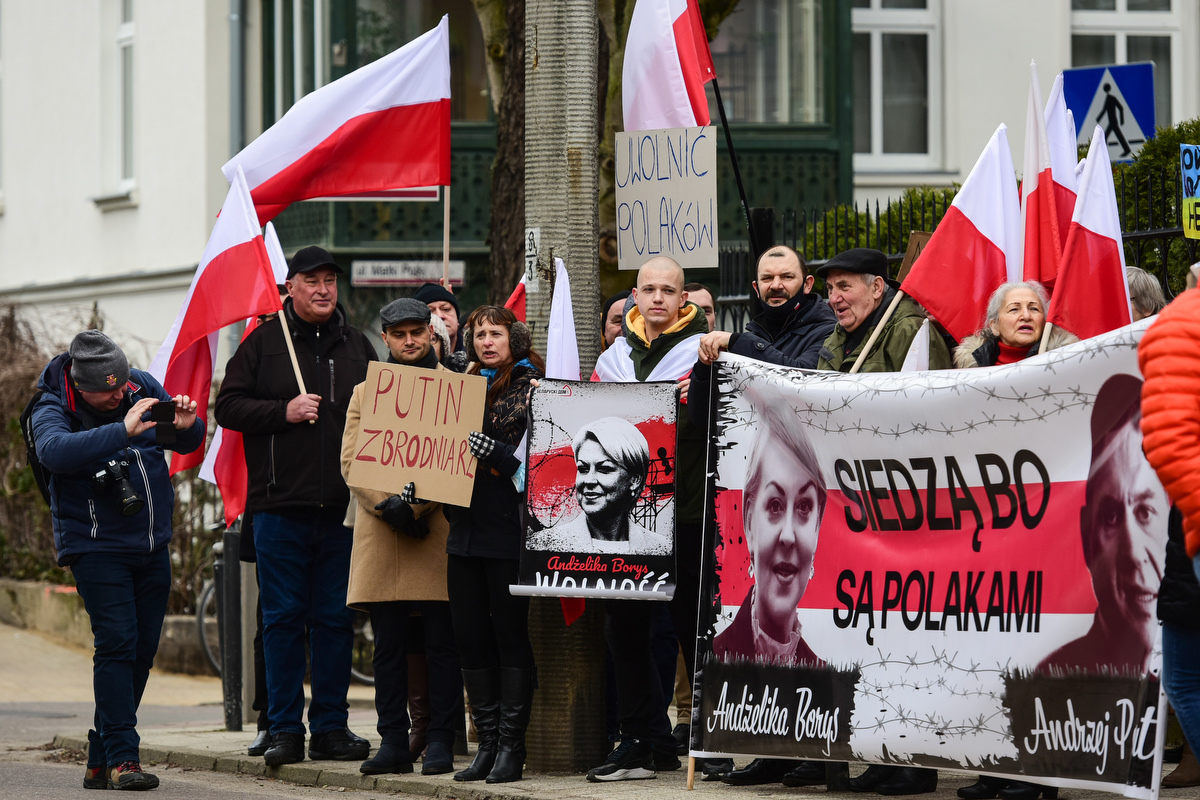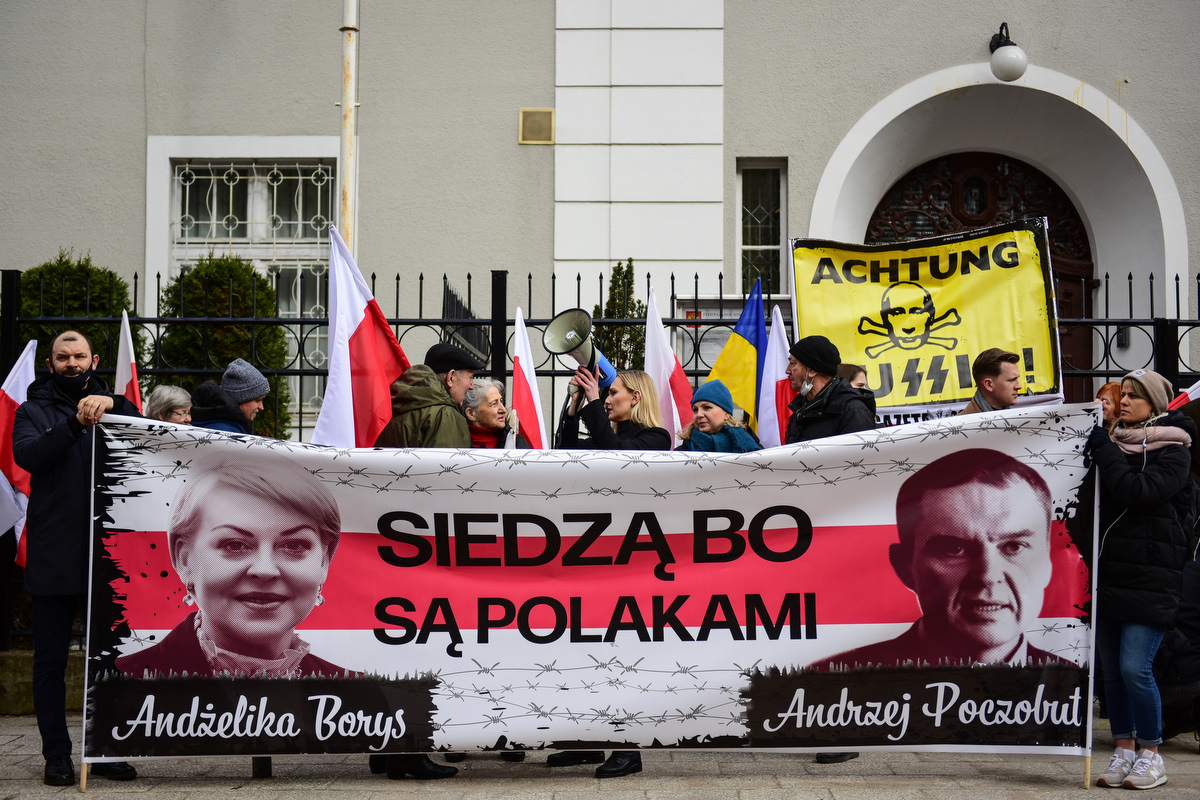 Manifestujący mieli m.in. transparenty z hasłami: „Andżelika Borys, Andrzej Poczobut. Siedzą, bo są Polakami”, „Achtung Russia”, „Putin zbrodniarz” czy „Wolna Ukraina”. Na początku pikiety zebrani odśpiewali hymn Polski.
