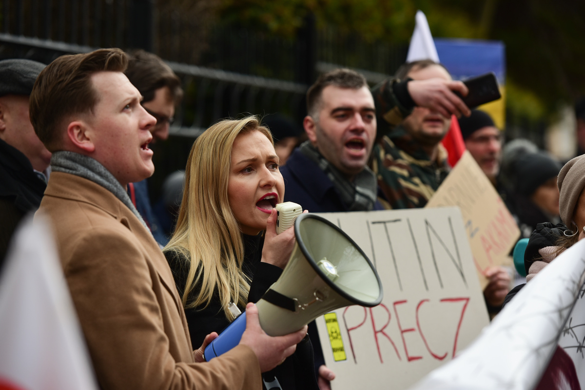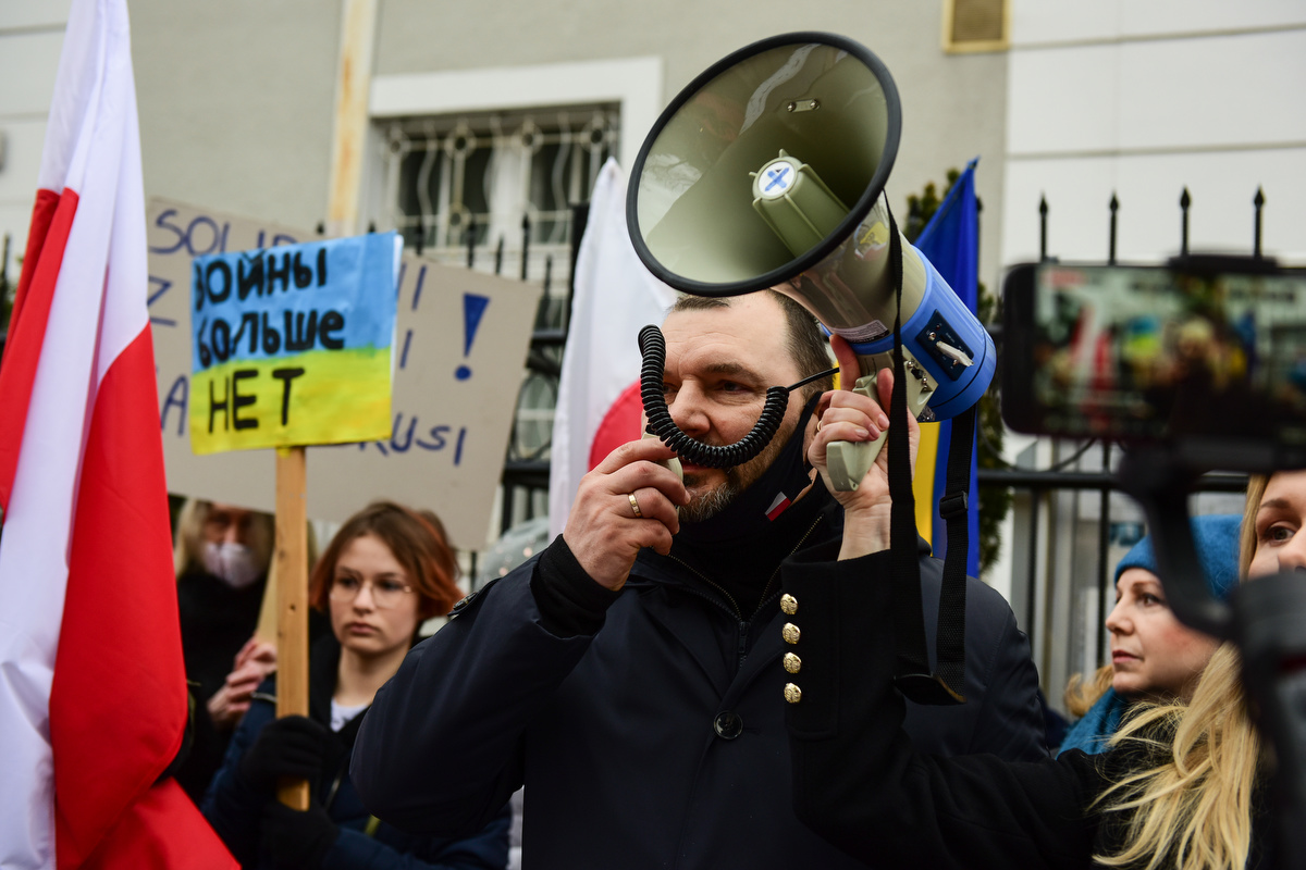 – Putin poszedł dalej, Putin terrorysta morduje ludzi na Ukrainie. Morduje tylko po to, żeby napełniać swoją kabzę i rozdymać swoje ego. Jesteśmy tu dzisiaj żeby wyrazić swój sprzeciw. Precz z Putinem – mówiła do zebranych. Manifestujący skandowali: „Precz z Putinem”, „Putin won”, „Kijów, Warszawa – jedna sprawa”.