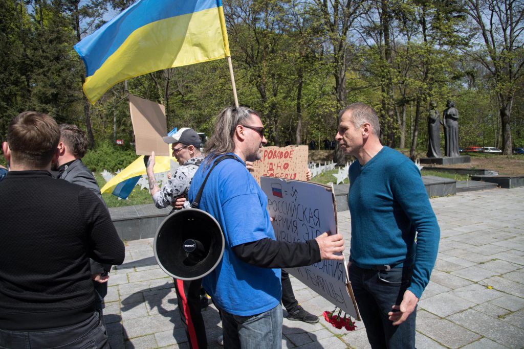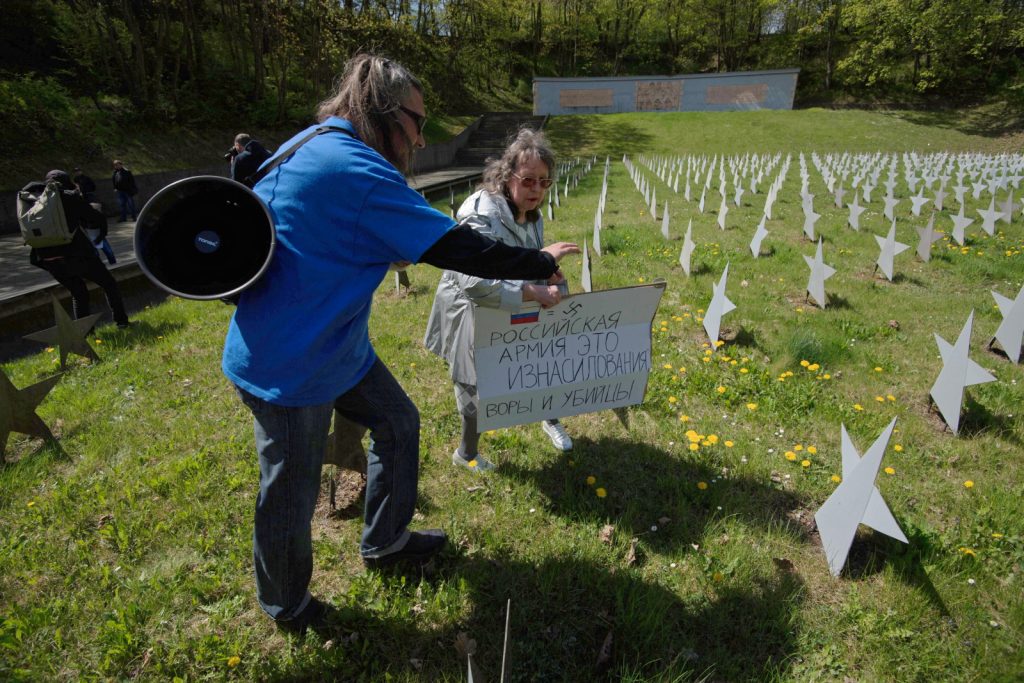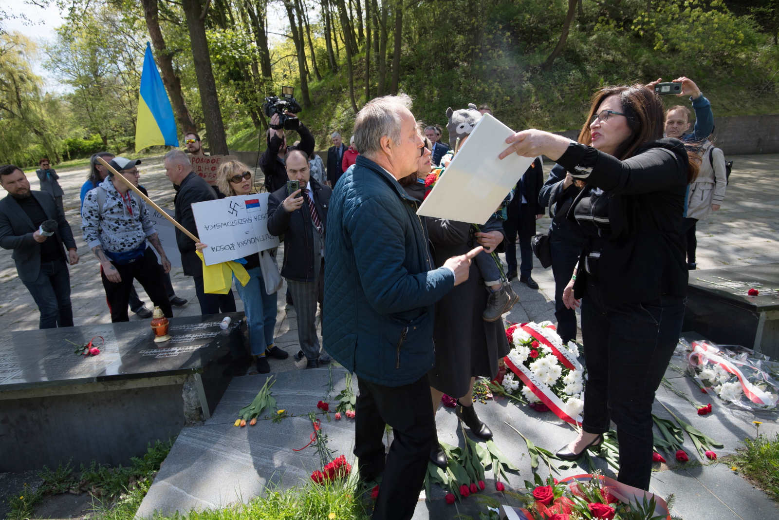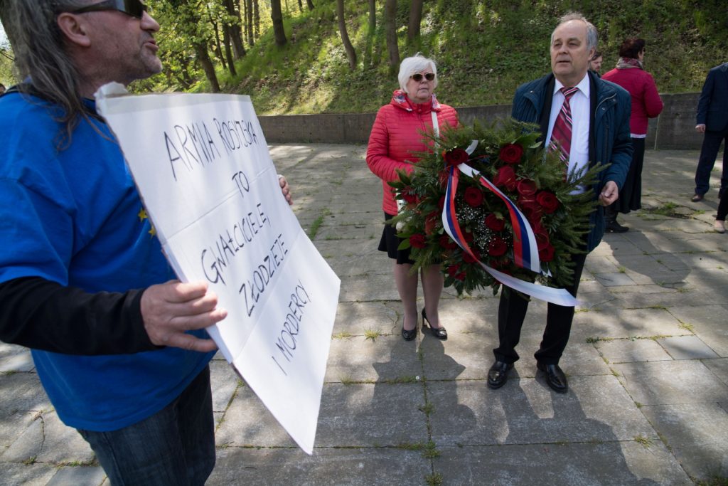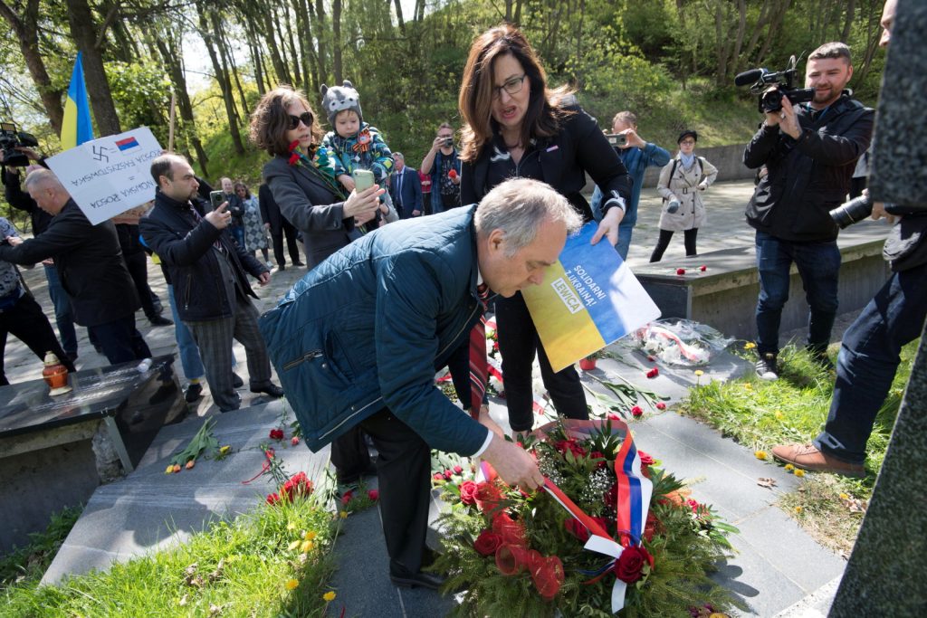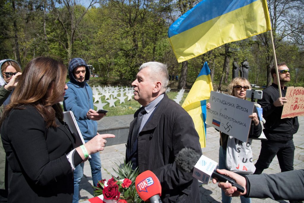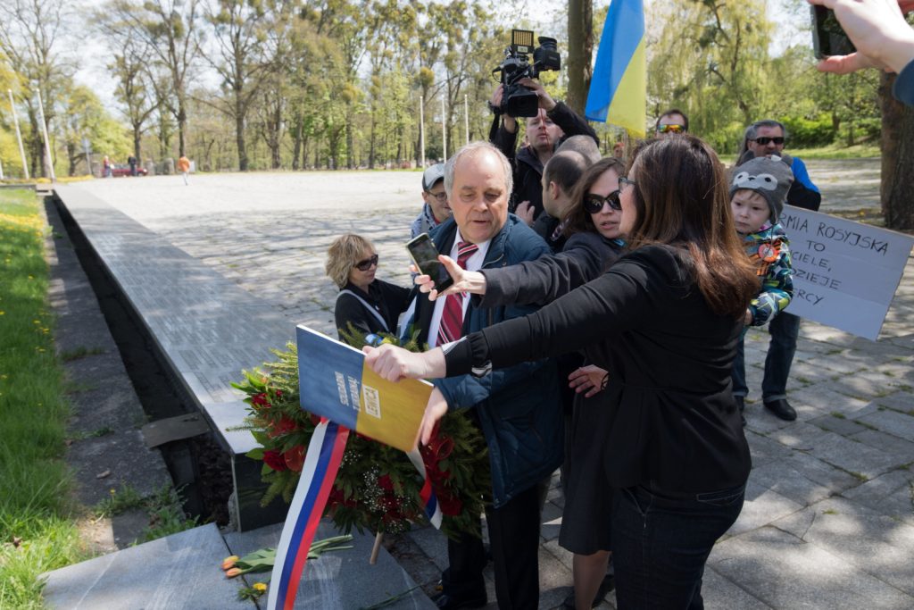 W składaniu kwiatów brali udział przedstawiciele konsulatu Federacji Rosyjskiej. Wcześniej, jeszcze zanim Rosjanie dotarli do nekropolii, przed cmentarzem pojawiła się kilkunastoosobowa grupa protestujących, wśród nich posłanka Lewicy Beata Maciejewska. Były okrzyki „mordercy” i tablice z hasłami: „jesteśmy z Ukrainą”, „Putin pod sąd wojenny”.