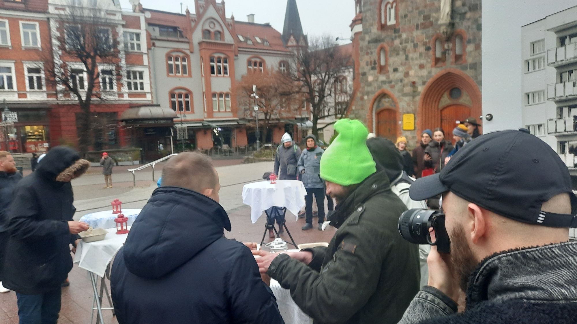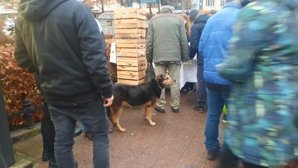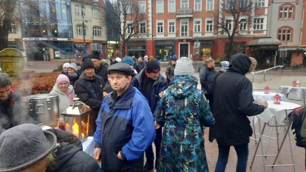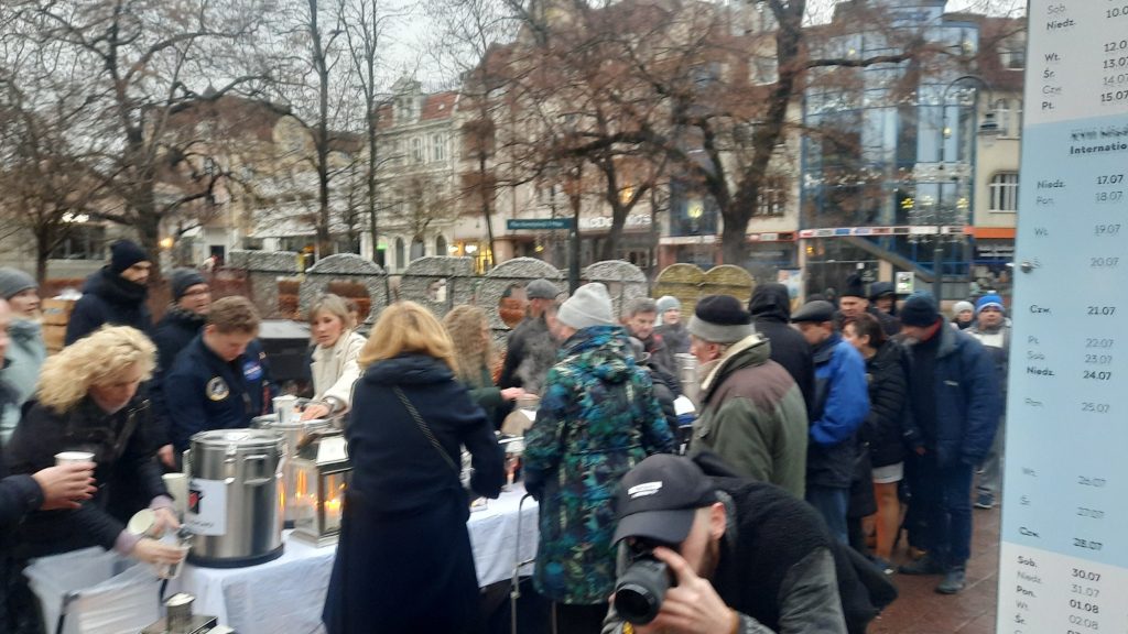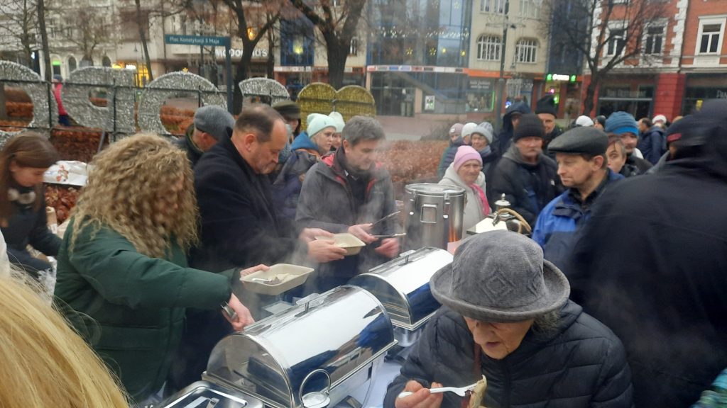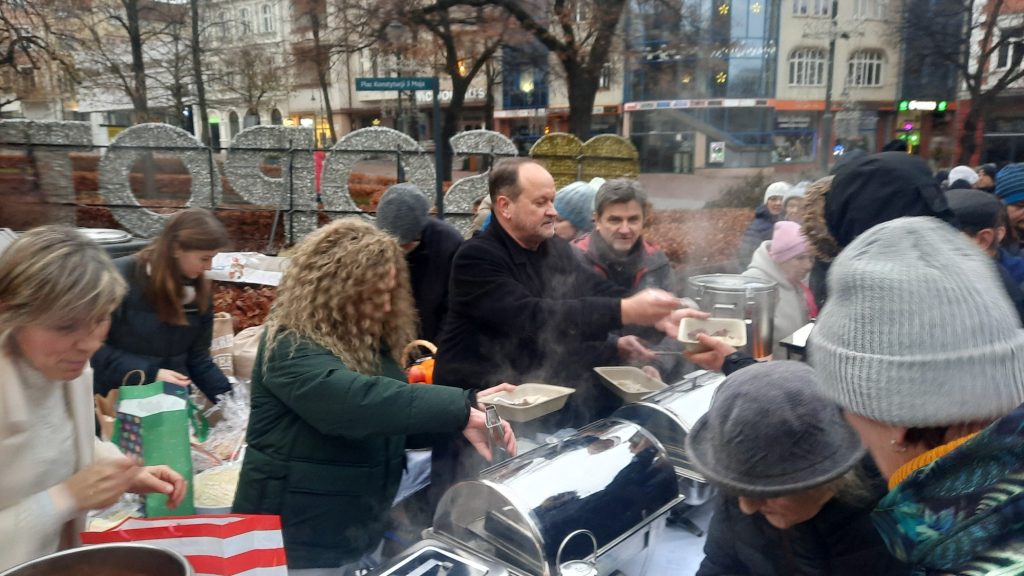 Na Monciaku, przy kościele św. Jerzego, punktualnie o godz. 15:00 pojawił się spory tłum tych, którzy przyszli tu głodni – i ciepłego posiłku i spotkania. Tych, którzy chcieli spotkać kapłana i przyjaciela, w osobie księdza Krzysztofa Niedałtowskiego, rektora z kościoła św. Jana. Ten duchowny ustawił się po drugiej stronie, razem z wolontariuszami nakładał bigos, pierogi i barszcz. Zobaczyłam go od razu, gdy pojawiłam się w tej dość długiej kolejce.