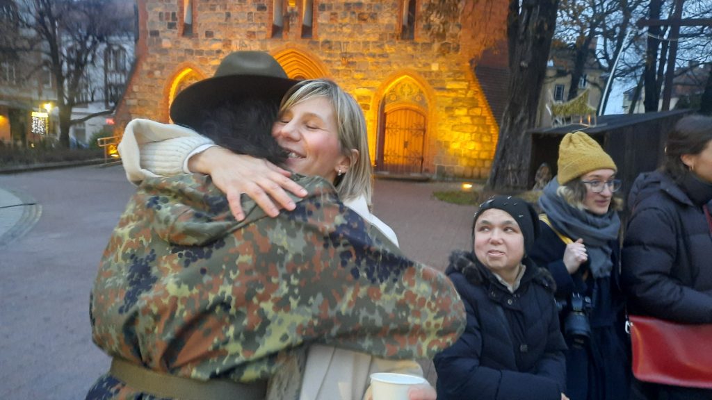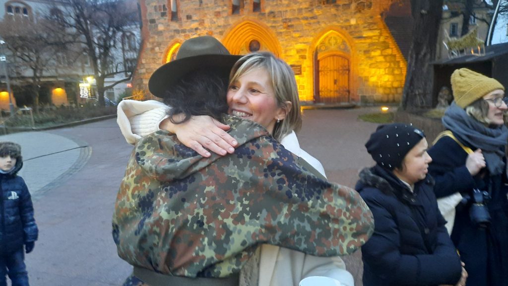 W tym samym czasie przyszło małżeństwo z posiłkiem zapakowanym w słoiki. Postawili ciepłą jeszcze zupę przed „moimi” Ukrainkami. Pięknie opakowany słoiczek. Bliskość i konkretność. Człowiek pomaga człowiekowi. Tak po prostu, by nie jeść w samotności. Przyszli tutaj, postawili zupę, chwilę porozmawiali z Ukrainkami. Panie podziękowały.