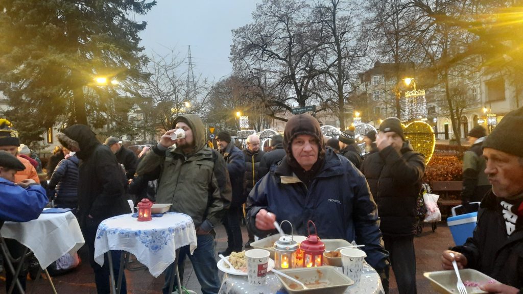 Ksiądz miał wśród tych osób sporo znajomych. Znali się po imieniu. Podchodzili do niego bez tremy, bez zbędnego namysłu, czy wypada podejść. Tam było widać pulsującą życzliwość i takie wspólne dźwiganie tego niełatwego losu. Ksiądz Krzysztof jest mistrzem słowa, tym razem jednak nikt nie wymagał od niego przemowy. On po prostu podawał ręce i słuchał. Zjadł kawałek chleba, napił się barszczu. Był jednym z nich i z nimi. To wystarczyło.