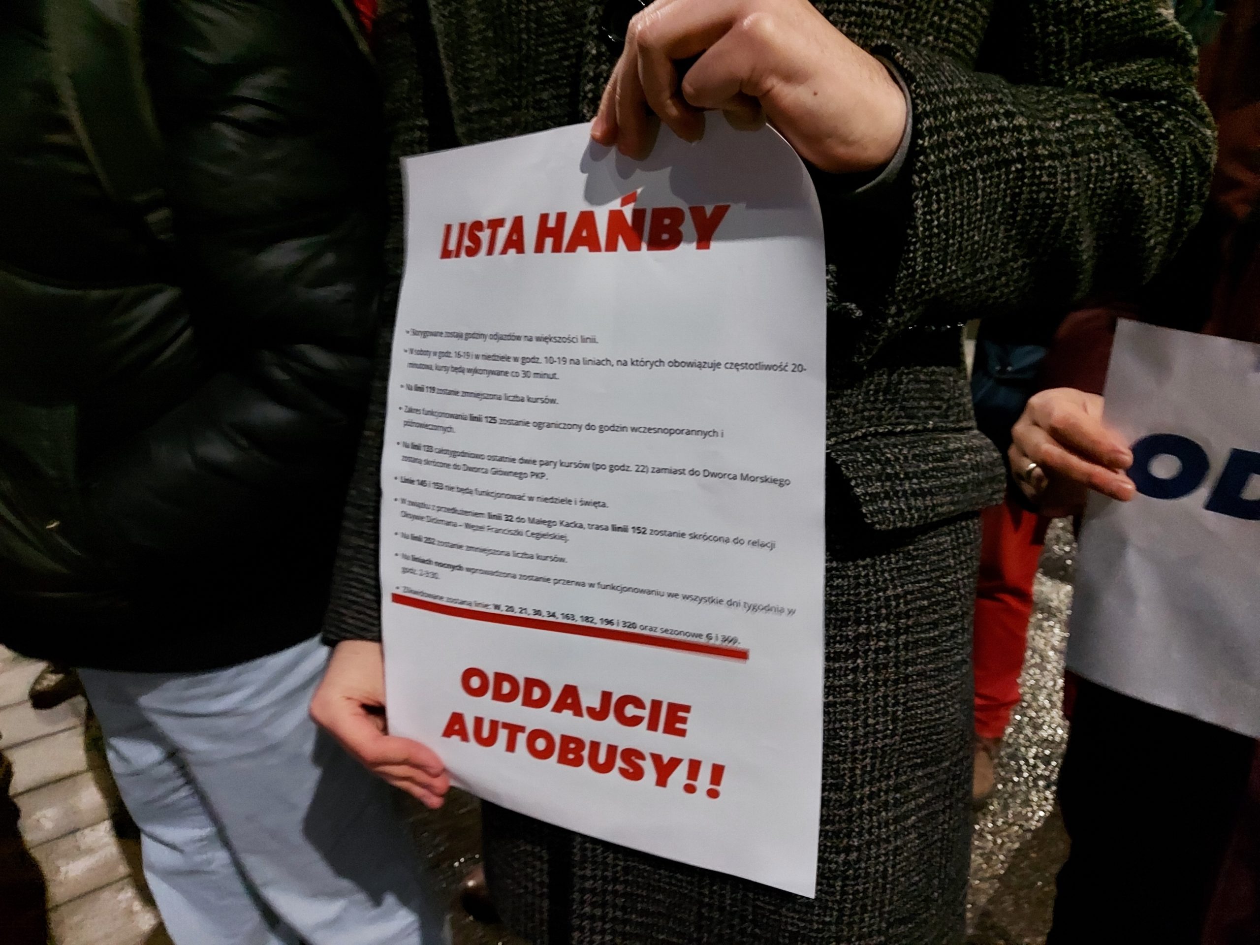 – Spotkaliśmy się tu, by zaprotestować przeciwko zmianom wchodzącym w życie w poniedziałek. Linia W jest szczególnie dla nas ważna, ale to nie wszystko, bo tak naprawdę co szesnasty kurs przestaje funkcjonować. Prezydent Wojciech Szczurek myli się; apelujemy, żeby poszukał oszczędności gdzie indziej. Szeroko pojęta promocja miasta to około dwudziestu milionów złotych, a jakbyśmy z tej puli jedynie pięć milionów przeznaczyli na komunikację miejską, to tych cięć by nie było – mówił radny Gdyni, Marcin Bełbot z PiS.