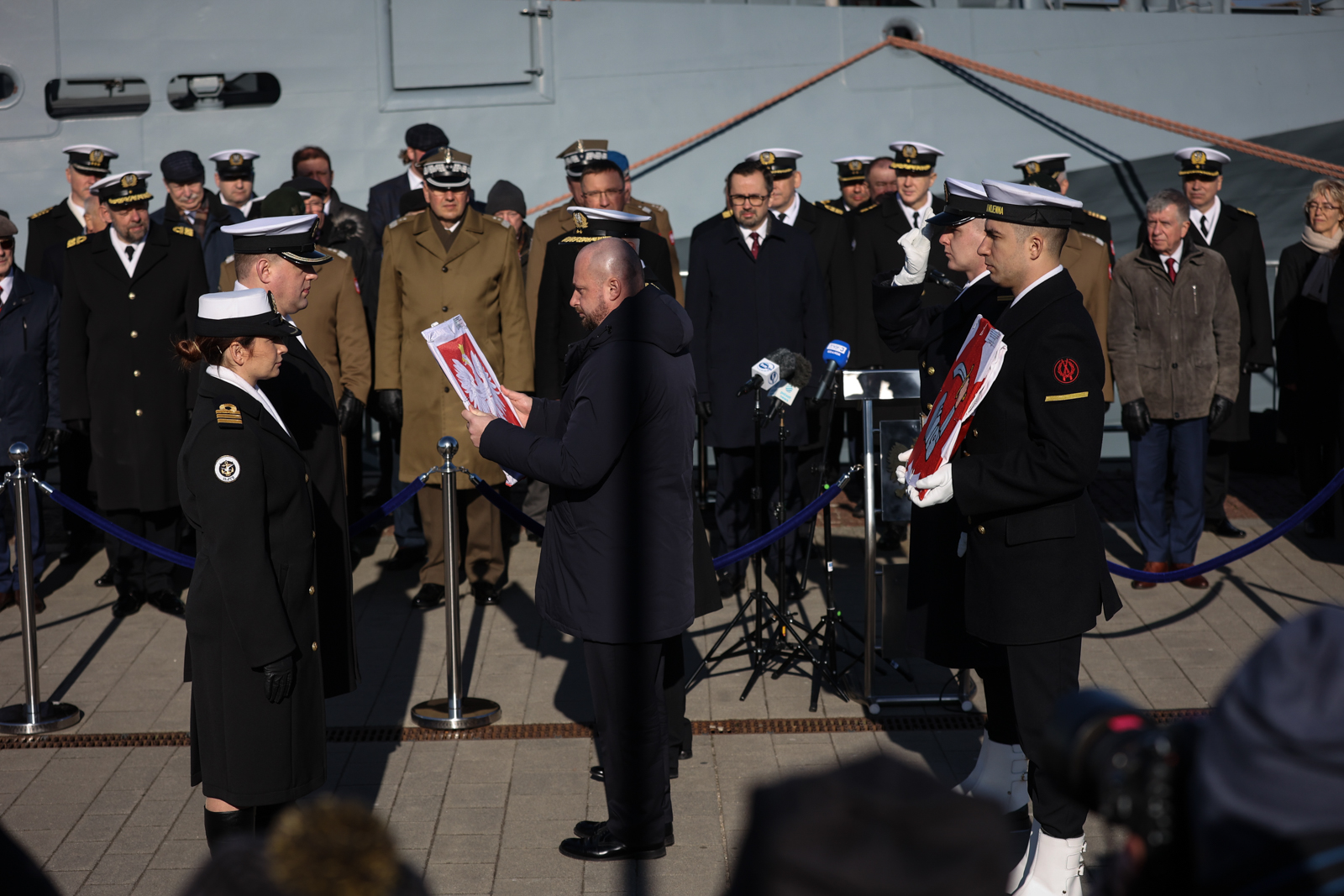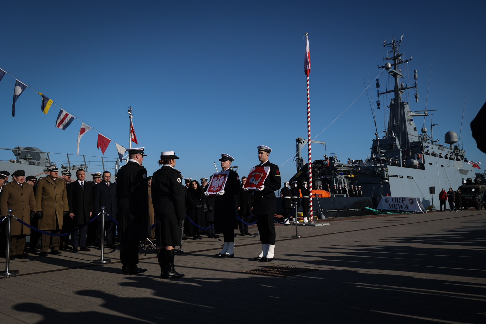 W uroczystości podniesienia bandery i wcielenia do służby ORP Mewa wzięli udział przedstawiciele władz państwowych, wojska, wojewoda pomorski Dariusz Drelich, samorządowcy oraz mieszkańcy.