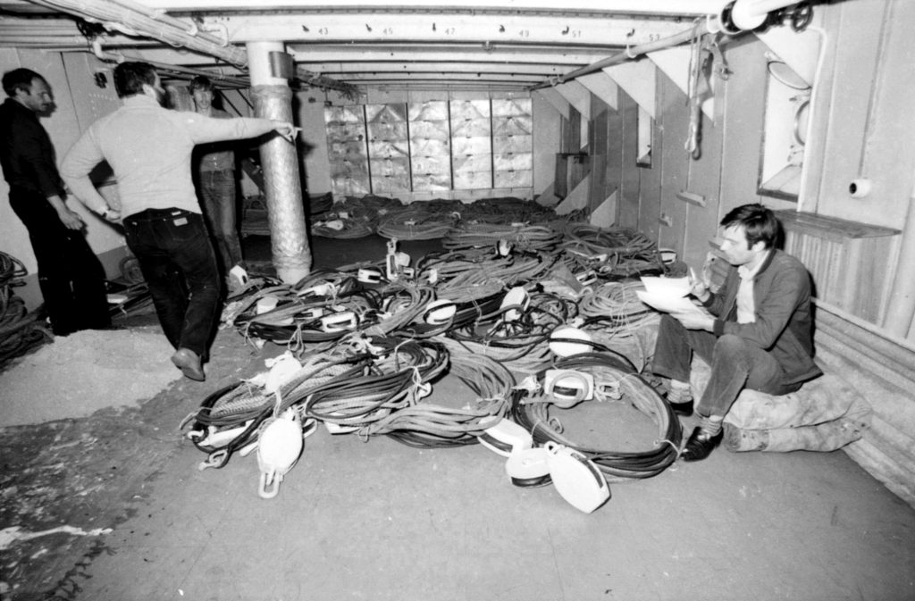 Przekształcanie żaglowca szkolnego w statek – muzeum. Inwentaryzacja zbioru lin i bloków w pomieszczeniu I wachty „Daru Pomorza”, 1982 r. (fot. Narodowe Muzeum Morskie)