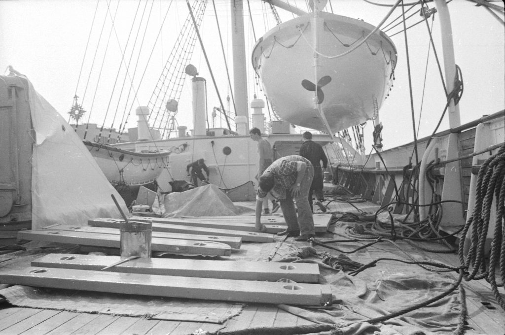 Prace naprawcze i malowanie podczas przygotowań statku do roli muzeum, 1982 r. (fot. Narodowe Muzeum Morskie)