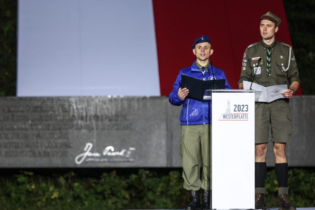 Harcmistrz Artur Lemański ze Związku Harcerstwa Polskiego oraz podharcmistrz Mateusz Świerzyński ze Związku Harcerstwa Rzeczpospolitej rozpoczęli odczytywanie „Przesłania Westerplatte”.