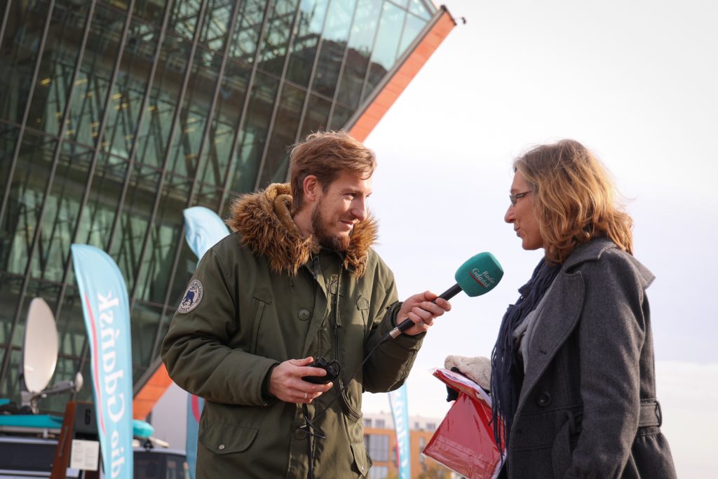 10 listopada kontynuowaliśmy odbywającą się z okazji jutrzejszego Narodowego Święta Niepodległości akcję rozdawania biało-czerwonych flag. Tym razem nasz wóz transmisyjny zajechał przed Muzeum II Wojny Światowej.