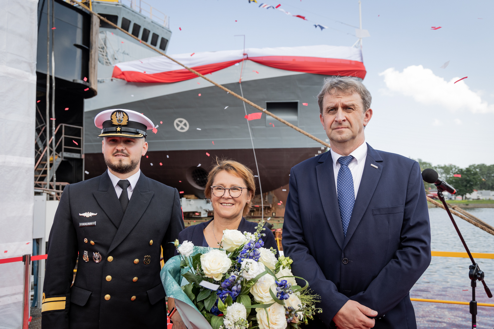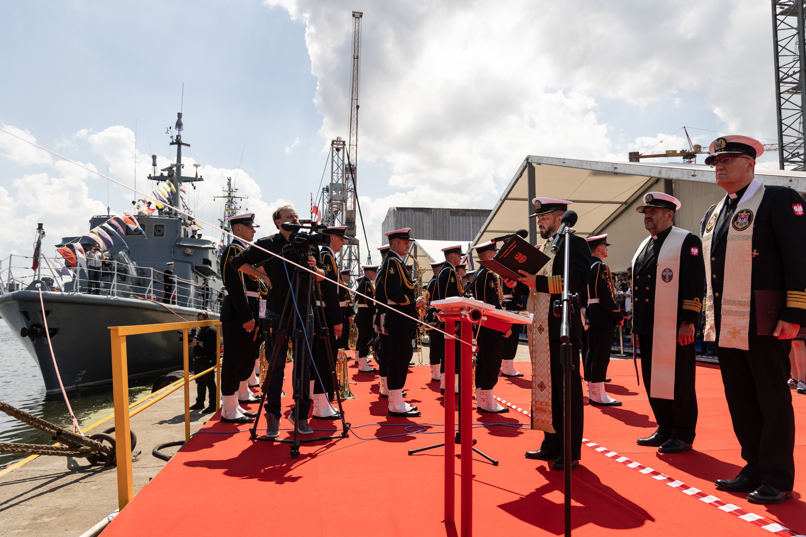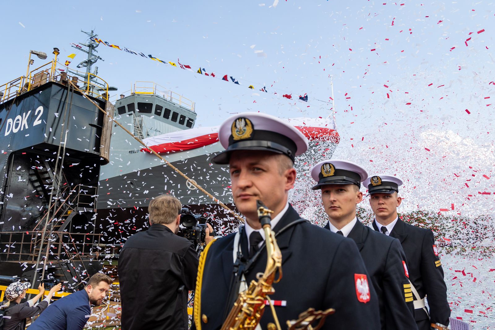 – Jesteśmy świadkami historycznej ceremonii – mówił Inspektor Marynarki Wojennej, wiceadmirał Jarosław Ziemiański. – Budowane okręty to odpowiedź na ciągle zagrożenie minami morskimi, które stwarzają realne niebezpieczeństwo dla żeglugi. Wodowanie odbywa się za pomocą doku pływającego. Jego sposób wynika z przyjętej technologii budowy – dodał.