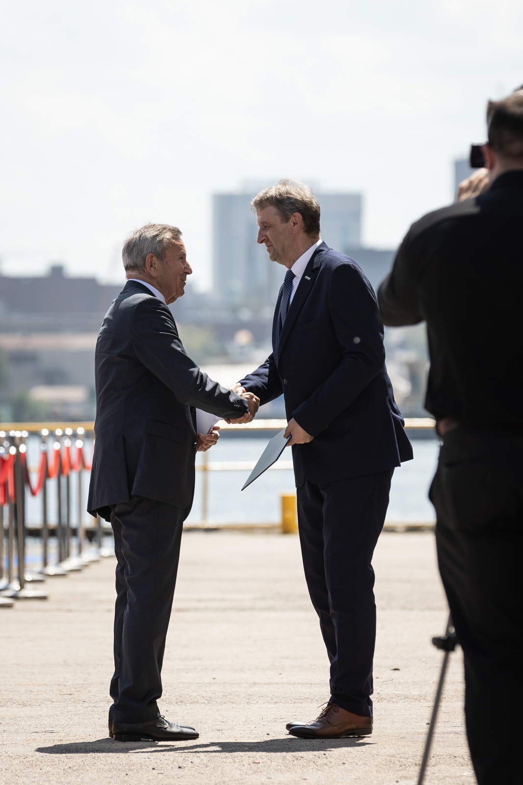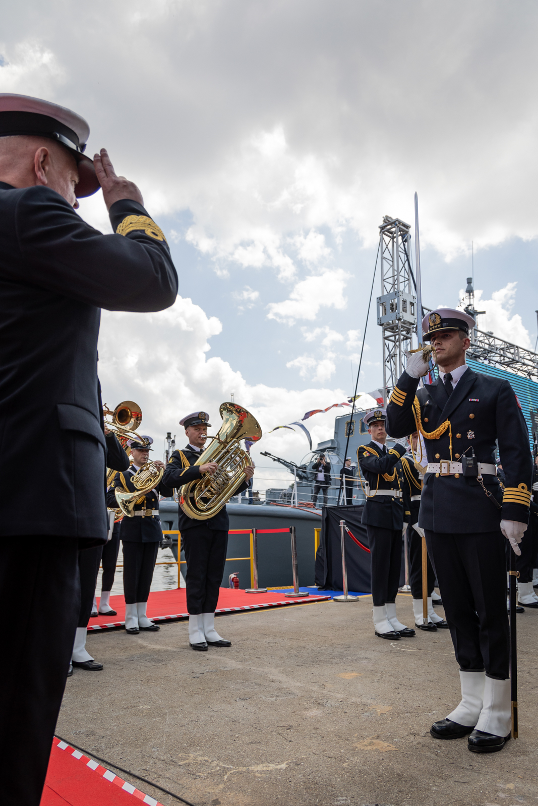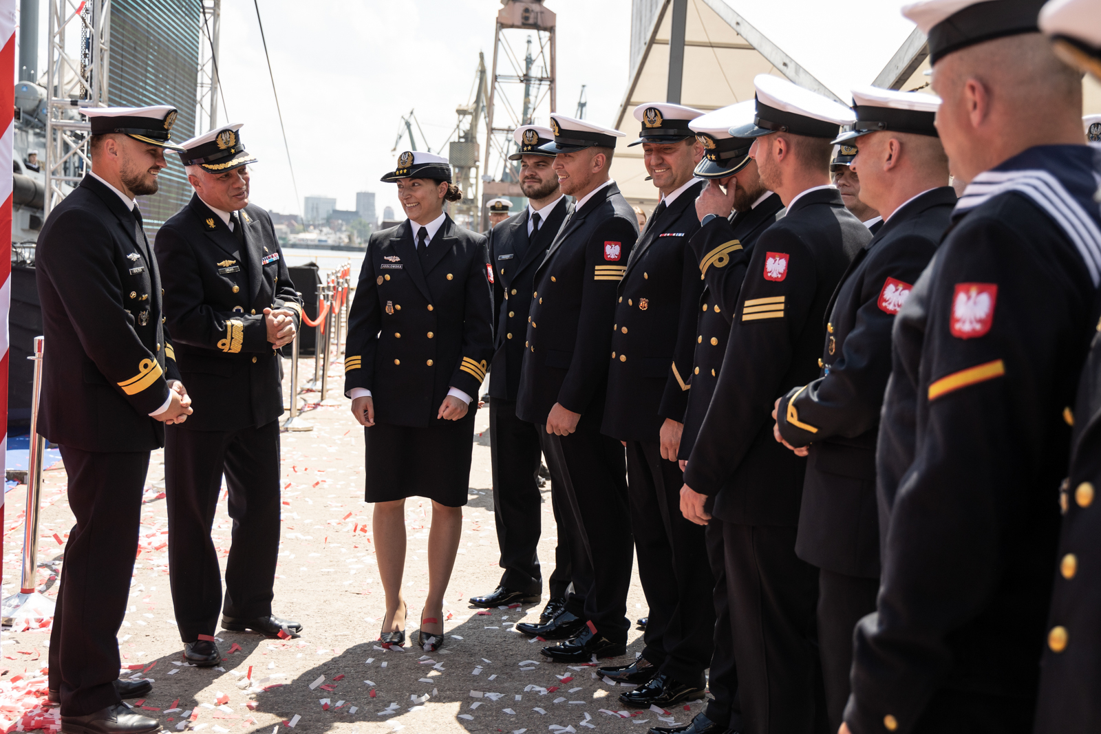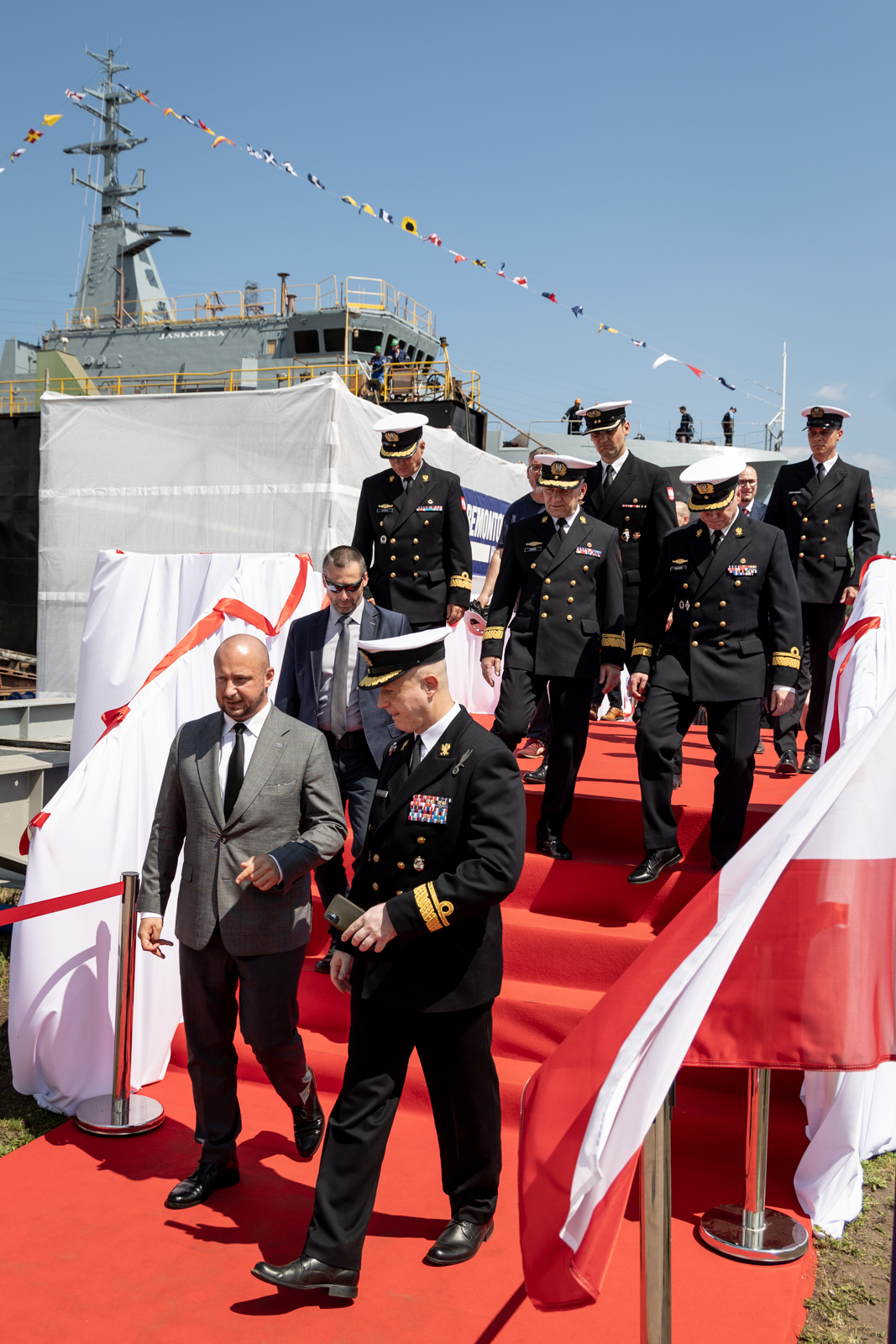 – Jesteśmy świadkami historycznej ceremonii – mówił Inspektor Marynarki Wojennej, wiceadmirał Jarosław Ziemiański. – Budowane okręty to odpowiedź na ciągle zagrożenie minami morskimi, które stwarzają realne niebezpieczeństwo dla żeglugi. Wodowanie odbywa się za pomocą doku pływającego. Jego sposób wynika z przyjętej technologii budowy – dodał.