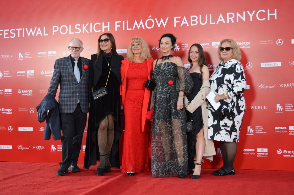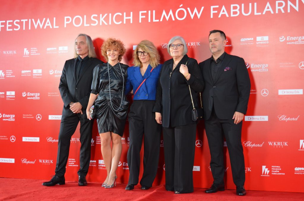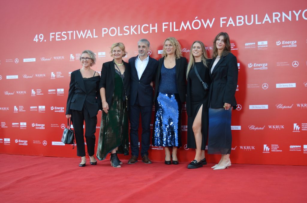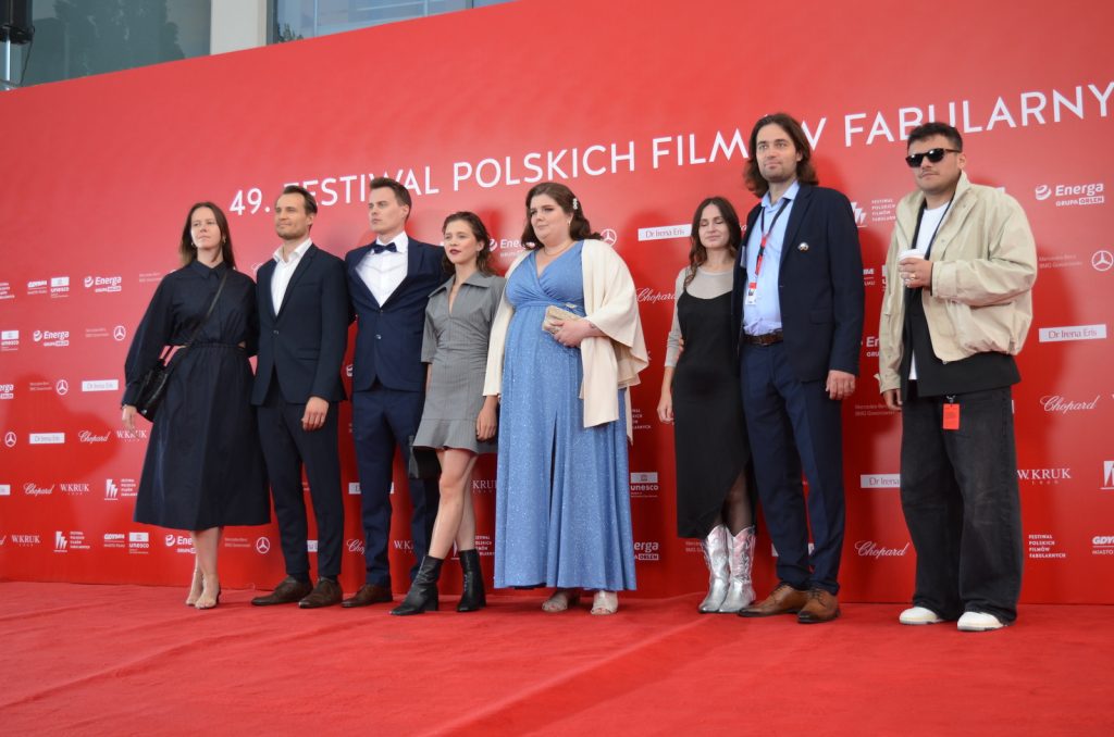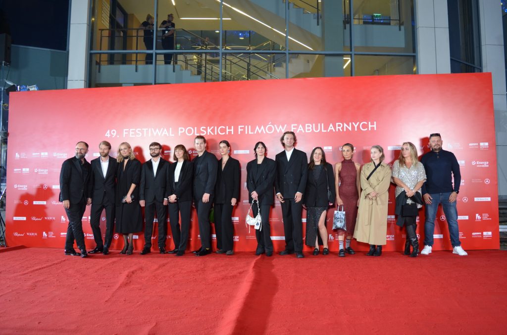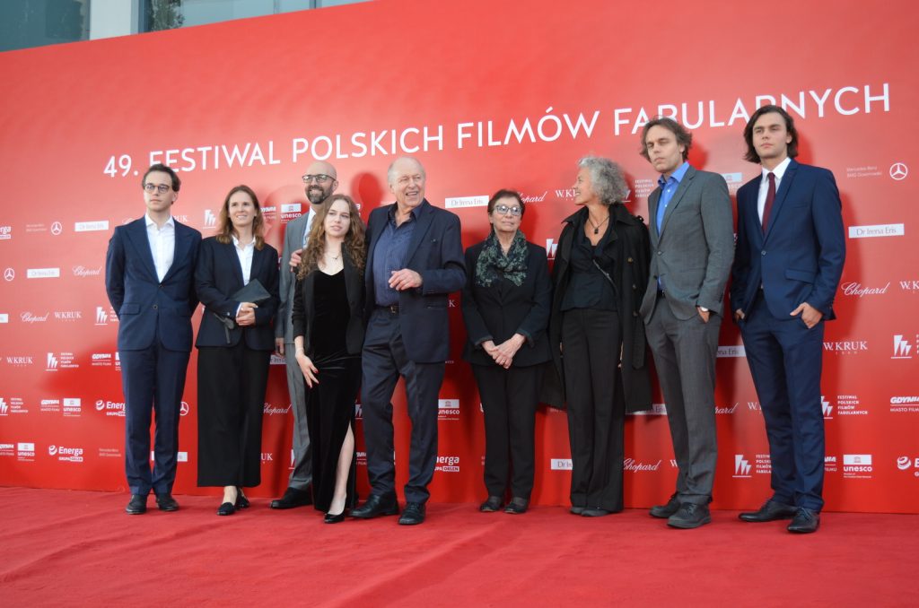Reżyser Xawery Żuławski z ekipą tworzącą film „Kulej. Dwie strony medalu” oraz członkami rodziny Jerzego Kuleja na czerwonym dywanie 49. FPFF. Film był drugim z najdłużej oklaskiwanych na festiwalu (fot. Radio Gdańsk/Piotr Puchalski)