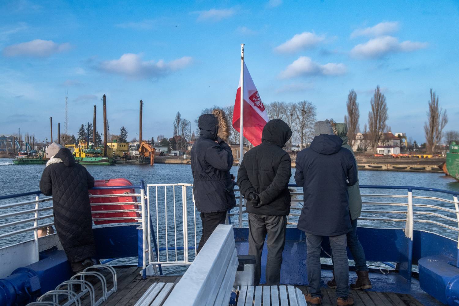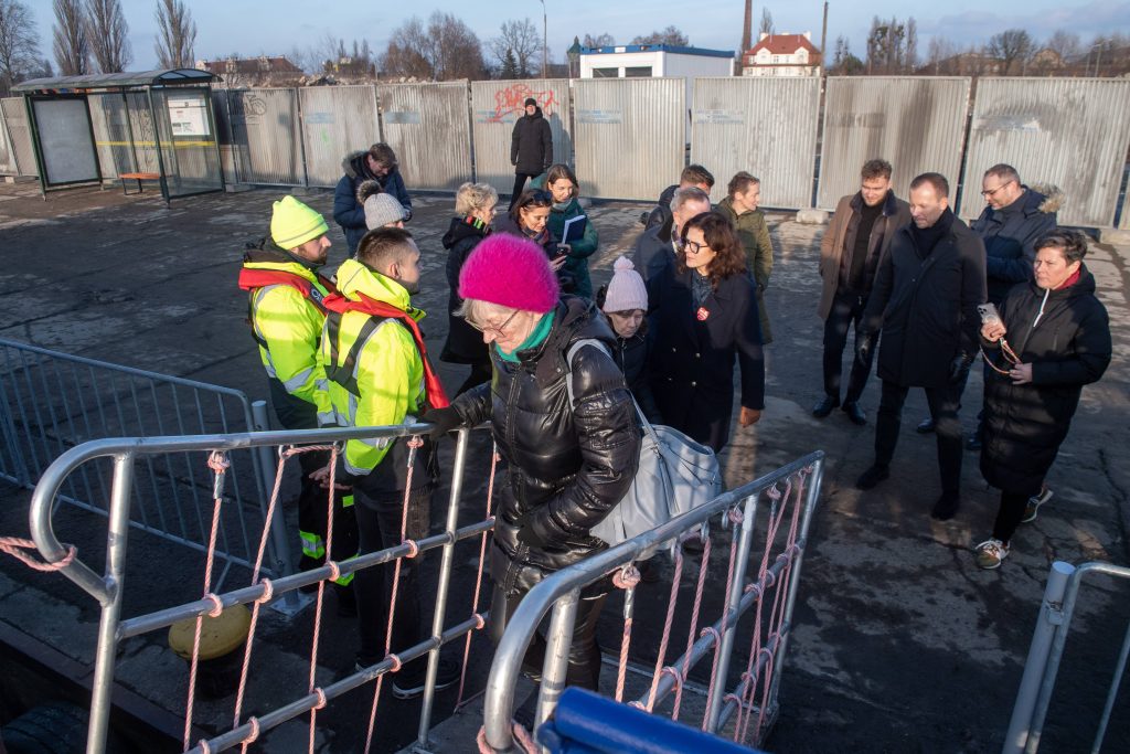 Testowy rejs promu F8 kursującego wzdłuż remontowanego mostu Siennickiego. W rejsie wzięła udział Aleksandra Dulkiewicz, prezydent Gdańska. 24.01.2025 r. (fot. Paweł Marcinko/KFP)