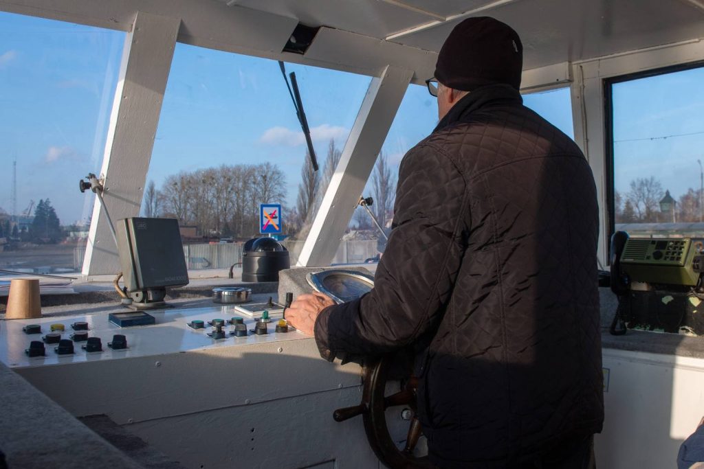 Testowy rejs promu F8 kursującego wzdłuż remontowanego mostu Siennickiego. Nz. kapitan promu „Danuta” Stanisław Baniewicz. 24.01.2025 r. (fot. Paweł Marcinko/KFP)