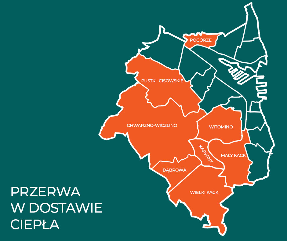 Na ten moment pozbawieni ciepłej wody i ogrzewania są mieszkańcy ośmiu dzielnic: Chwarzna-Wiczlina, Pogórza, Pustek Cisowskich-Demptowa, Karwin, Witomina, Dąbrowy oraz Małego i Wielkiego Kacka.