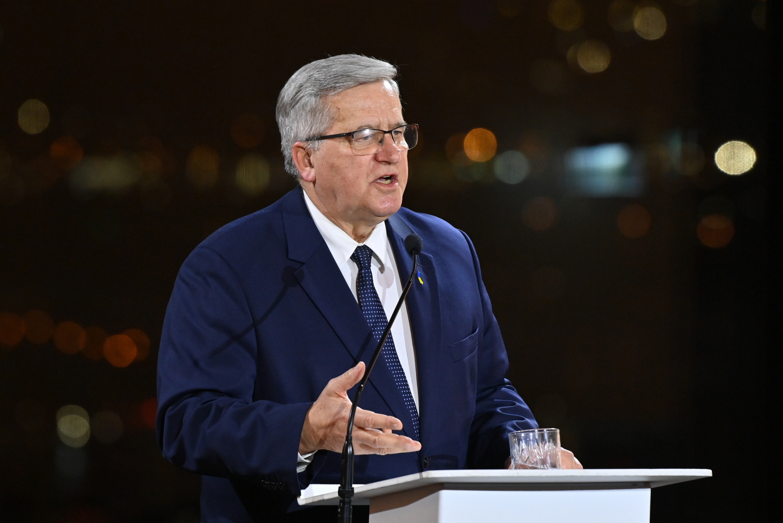 Były prezydent RP Bronisław Komorowski podczas wystąpienia otwierającego debatę „Jak zapewnić Bezpieczeństwo. Globalne zagrożenia i lokalne odpowiedzi” w budynku Olivia Star w Gdańsku, (Fot. PAP/Andrzej Jackowski)
