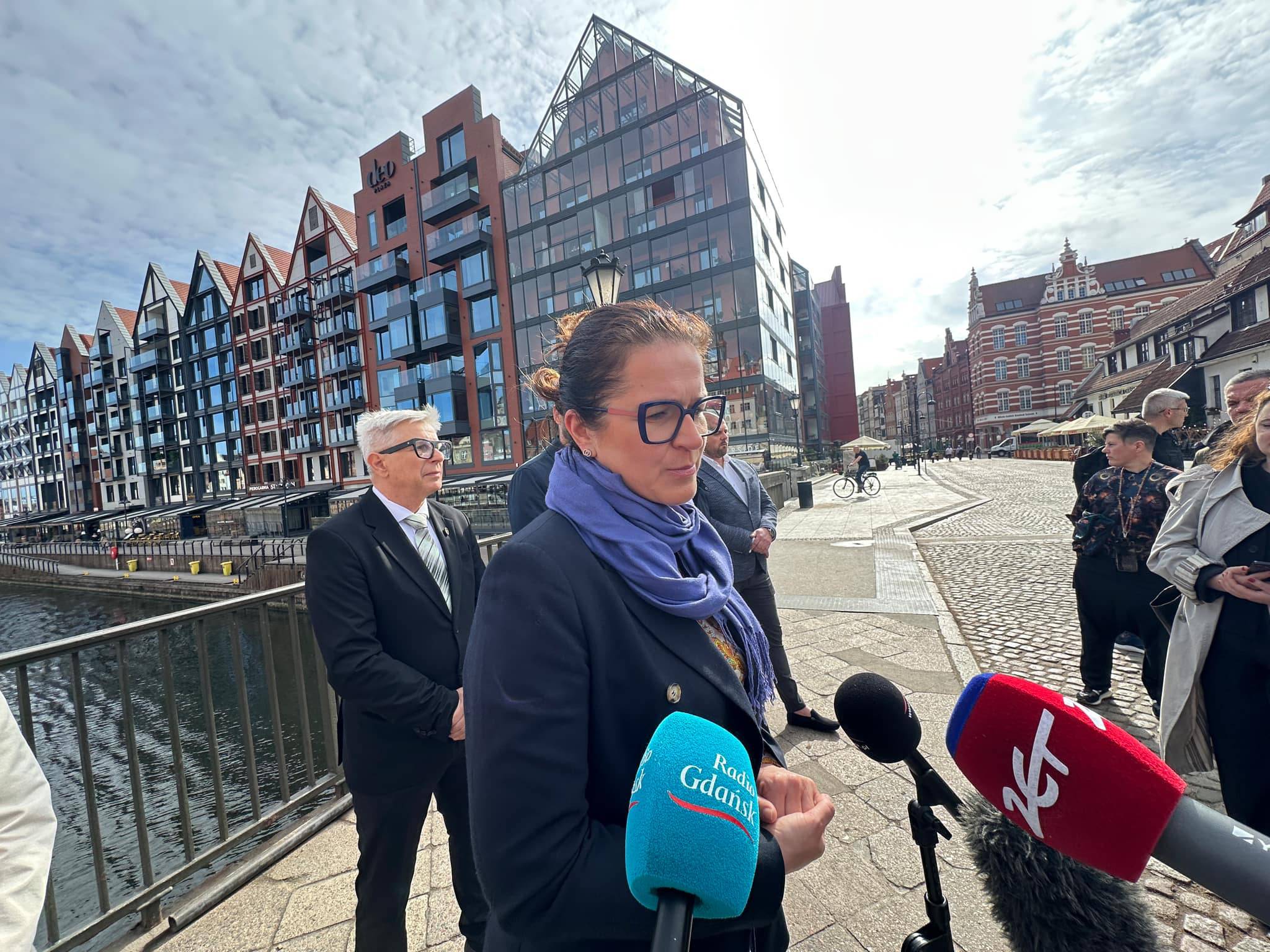 Aleksandra Dulkiewicz w czasie briefingu dot. zakończenia remontu Długiego Pobrzeża w Gdańsku – 30.04.2025 r. (fot. Radio Gdańsk/Oskar Bąk)