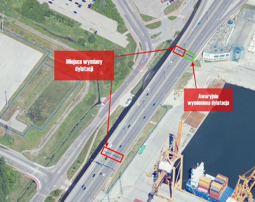 Estakada Kwiatkowskiego z zaznaczonymi miejscami planowanej i awaryjnie przeprowadzonej wymiany dylatacji (gdynia.obliview.com)