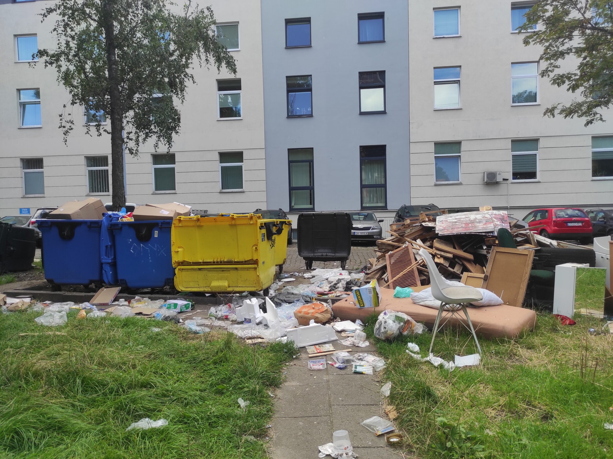 Mieszkańcy twierdzą, że wysypisko na środku podwórka powstało m.in. z powodu braku altany śmietnikowej. Odpady mają wysypywać bezdomni, a także osoby z innych części miasta, które nielegalnie podrzucają śmieci. W związku z tym lokatorzy mają wiele zastrzeżeń w stosunku do administratora – „Zarządzanie Nieruchomościami DOM – Rafał Załęski”.