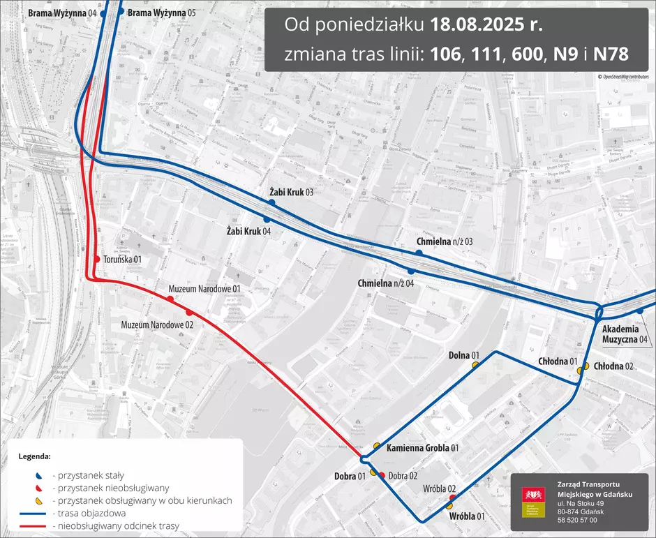 – Zmiana trasy będzie polegała na tym, że autobusy zamiast skręcać w ulicę Toruńską, pojadą ulicą Podwale Przedmiejskie, zatrzymają się na przystankach Żabi Kruk i Chmielna, a następnie skręcą w ulicę Łąkową, którą dojadą do ulicy Toruńskiej. Dalej pojadą ulicą Kamienna Grobla, by wrócić w kierunku Podwala Przedmiejskiego. Na tej pętli obsługiwane będą przystanki: Chłodna, Dolna, Kamienna Grobla, Dobra i Wróbla. Zmiany w rozkładach potrwają do grudnia, czyli do czasu zakończenia inwestycji. Różnice w kursowaniu są niewielkie i wyniosą od 2 do 6 minut – wyjaśniał.
