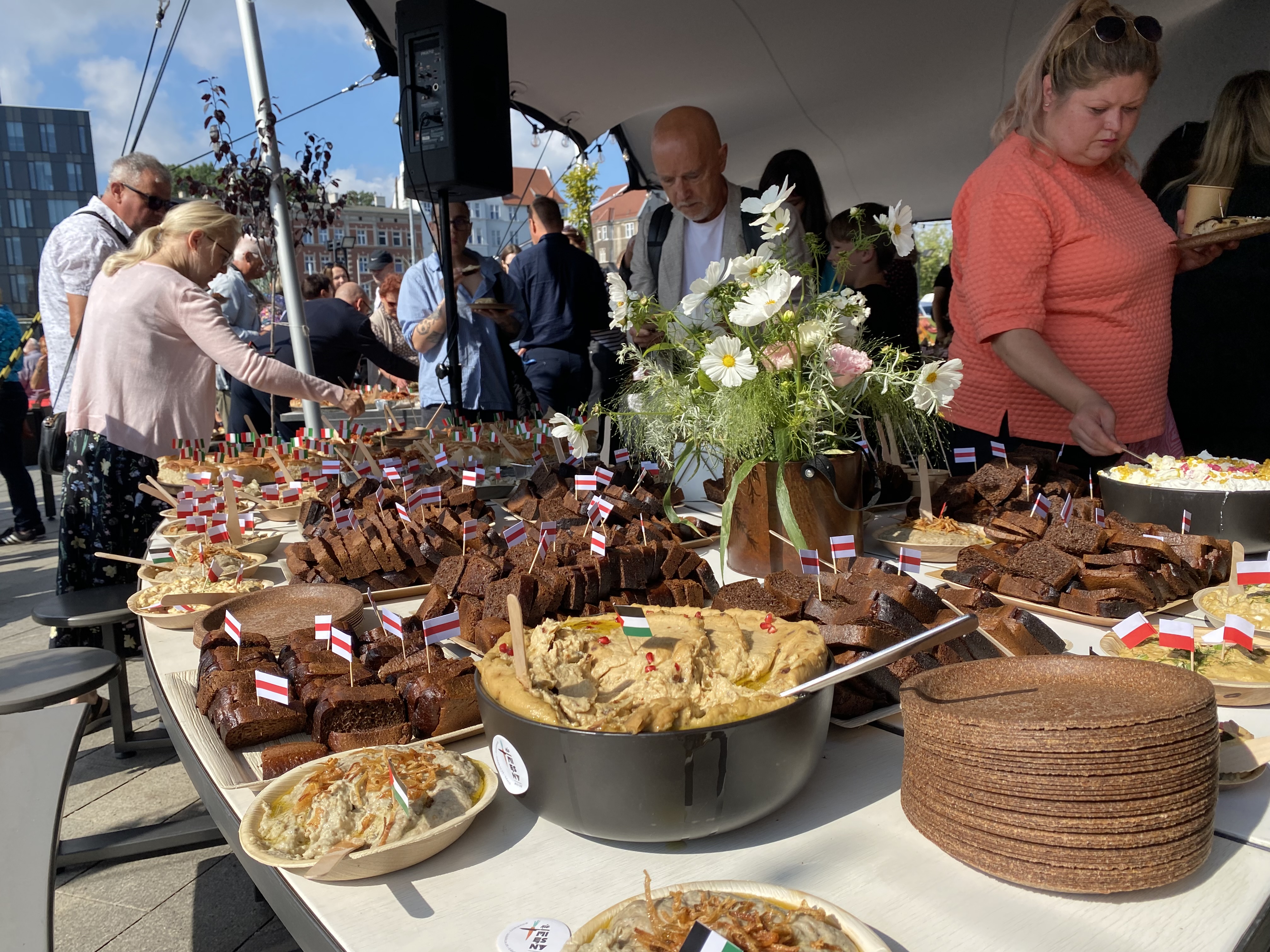 Drugie śniadanie międzykulturowe – pod tym hasłem przy wspólnym, okrągłym stole przed Europejskim Centrum Solidarności spotkali się o godz. 11:00 uczestnicy jubileuszowego dnia obchodów 45-lecia podpisania Porozumień Sierpniowych i zakończenia strajku w Stoczni Gdańskiej.