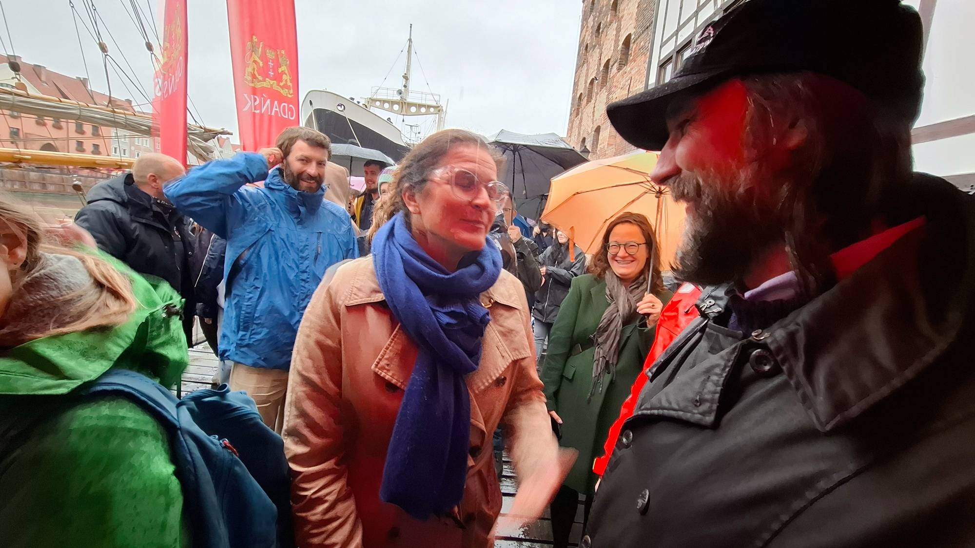 Uroczyste powitanie odbyło się w strugach deszczu, ale w gorącej atmosferze. Oczekujących na nabrzeżu rozgrzewał Męski Chór Szantowy „Zawisza Czarny”.