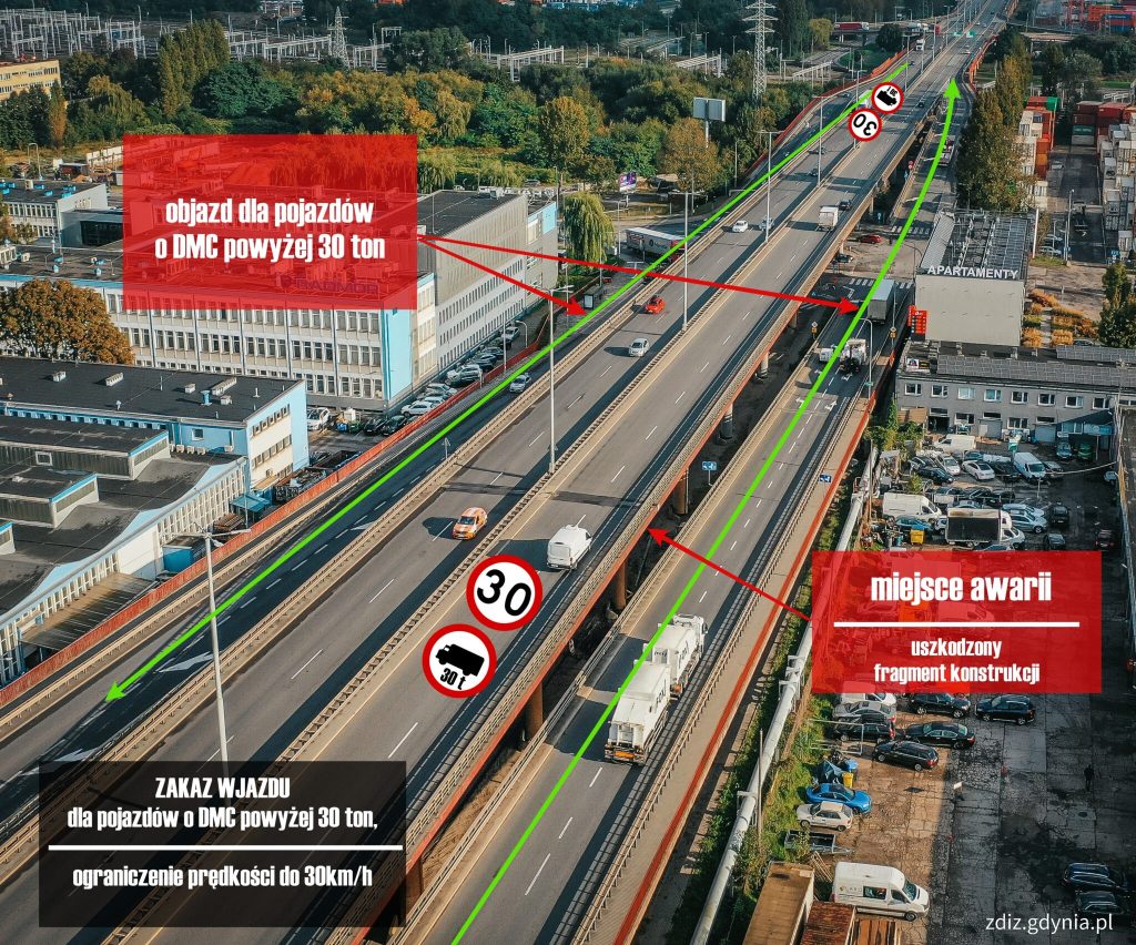 Zgodnie z wynikami ekspertyzy technicznej niższa prędkość pomaga więc zmniejszyć siły działające na konstrukcję i zapewnić bezpieczeństwo użytkownikom. Na odcinku estakady nadal obowiązuje zakaz wjazdu dla pojazdów ciężarowych o DMC powyżej 30 ton. Objazd dla ciężarówek wyznaczono łącznicami w rejonie ul. Hutniczej – zarówno w kierunku portu, jak i Obwodnicy Trójmiasta.