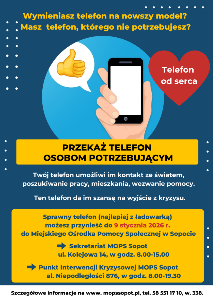 Zbiórka telefonów potrwa do 9 stycznia 2026 roku. Szczegółowe informacje można uzyskać pod nr tel. 58 551 10 10 oraz na stronie internetowej Miejskiego Ośrodka Pomocy Społecznej w Sopocie. Telefony można przynosić do siedziby głównej Miejskiego Ośrodka Pomocy Społecznej w Sopocie przy ul. Kolejowej 14 od poniedziałku do piątku w godz. od 8:00 do 15:00, a także do Punktu Interwencji Kryzysowej Miejskiego Ośrodka Pomocy Społecznej w Sopocie przy al. Niepodległości 876 od poniedziałku do piątku w godz. od 8:00 do 19:30.