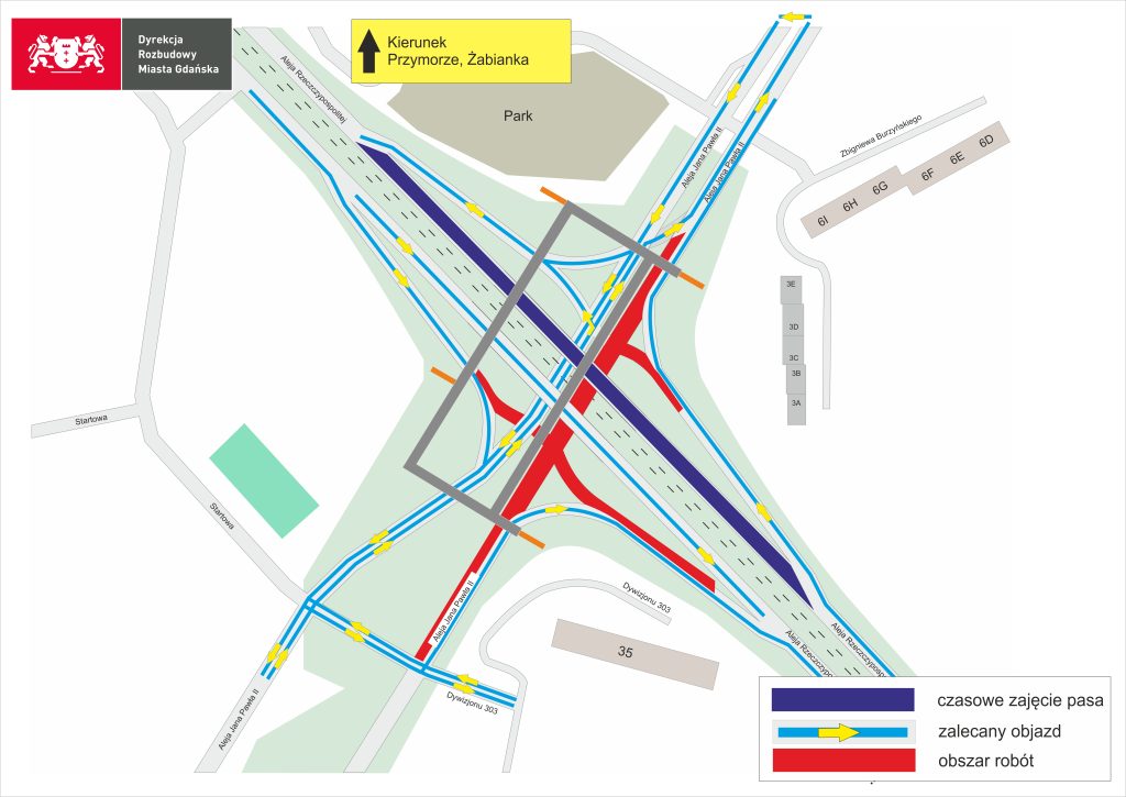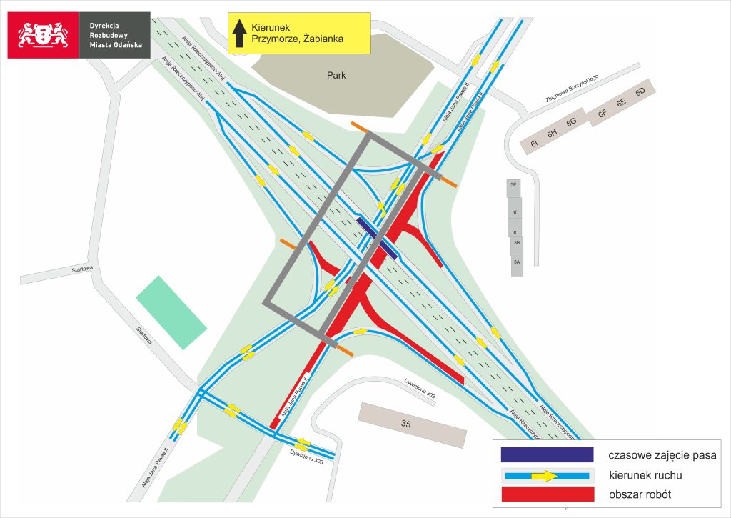 Od godziny 22:00 do godziny 5:00 zamknięty zostanie fragment jezdni al. Rzeczypospolitej w kierunku Żabianki. Z ruchu zostaną wyłączone wszystkie pasy. W tym czasie zalecany jest objazd z wykorzystaniem nawrotki w al. Jana Pawła II. W ciągu dnia na fragmencie na wysokości kładki planowane jest zawężenie lewego pasa jezdni w kierunku Żabianki.